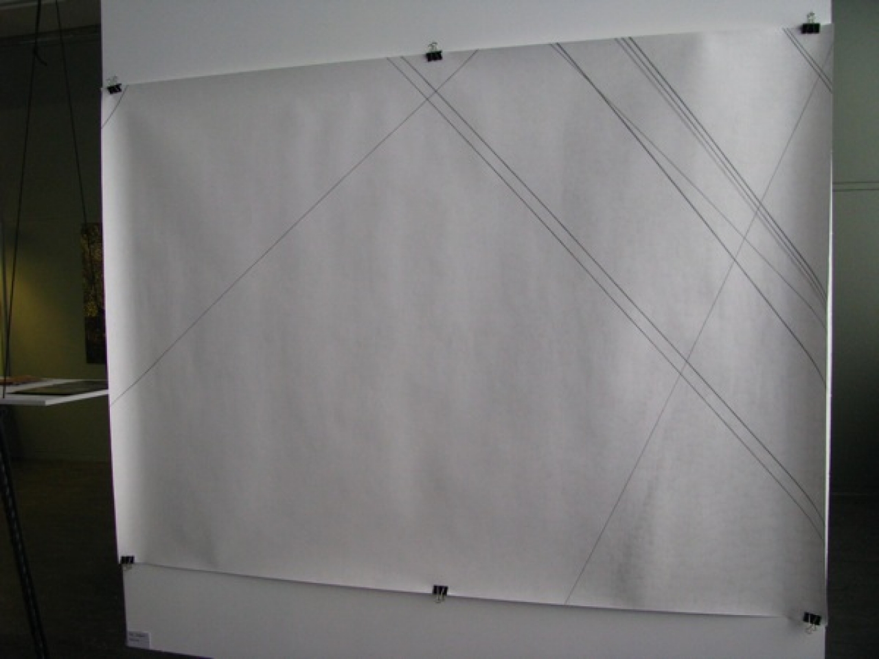 Kelly Salemink (Fotografie) tekeningen en fotowerken; allereerst een foto van een krijttekening naar een foto van de lucht, daaronder de potloodtekening naar een foto van electriciteitsdraden. Iedere tekening is heel fijn opgezet met dunne lijntjes