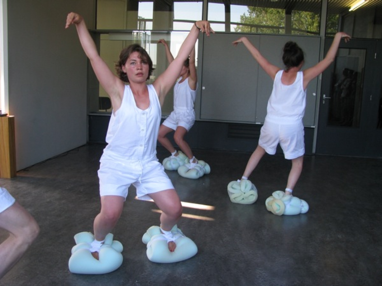 Clarinde Wesselink (Fine Arts) performance met 5 personen in witte pakjes en schuimrubber schoeisel die bewegen en oefeningen doen op het ritme van de klik-klak klinkende hakken van Clarinde die elders door het gebouw loopt