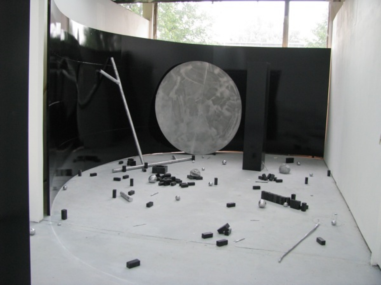 Koen Kloosterhuis: ruimtelijke installatie. Met alleen zwart en zilverkleurige elemanten werd deze ruimte ingevuld met balkjes, blokjes, zuilen, kogels en ballen (niet perfect bolvormig), een ronde schijf en een wand die in een curve de ruimte afbakent. Hier en daar lagen er ook objecten als een kam, zeep, tandenborstel en vork op de vloer.