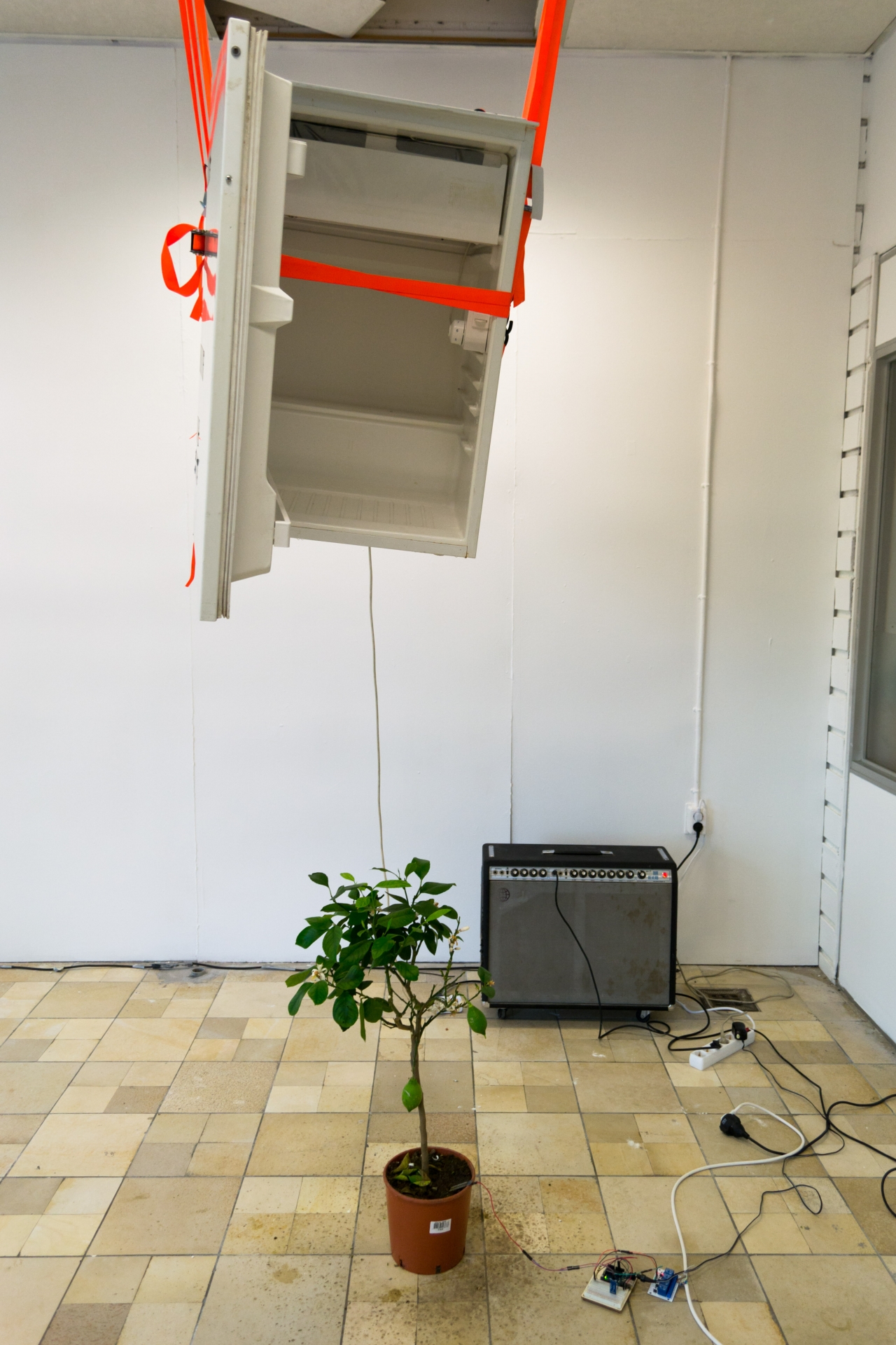 Bij het werk van Domas van Wijk kom ik ogen tekort. Zijn installatie is een kinderfeestje waar mijn ouders me liever niet naartoe zouden laten gaan, maar waar ik maar al te graag voor uitgenodigd zou worden. Het lijkt geïnspireerd te zijn op Der Lauf der Dinge, een kettingreactie van kunstenaarsduo Fischli en Weiss, waarbij bewegingen en handelingen op elkaar volgen. Door het combineren van ongebruikelijke objecten als een wulps hondenspeeltje, een piepende valentijnskaart en elektrische gitaren, maakt Van Wijk zijn werk spannend en speels. Het meest in het oog springend is de reeks met de koelkast, die bungelend aan een fluorescerend oranje touw vecht tegen de zwaartekracht. De continu draaiende waterkoker op de grond stoot hete dampen uit, die door de koelkast worden gecondenseerd. Langzaam druppelt het water naar beneden om de citroenboom te voorzien van een vloeibare lunch. Mijn vriendin is voor het eerst die dag even stil. Na minutenlang ademloos gekeken te hebben, spreekt zij: ‘Een rotzooi. Maar wel een heel vette rotzooi.’