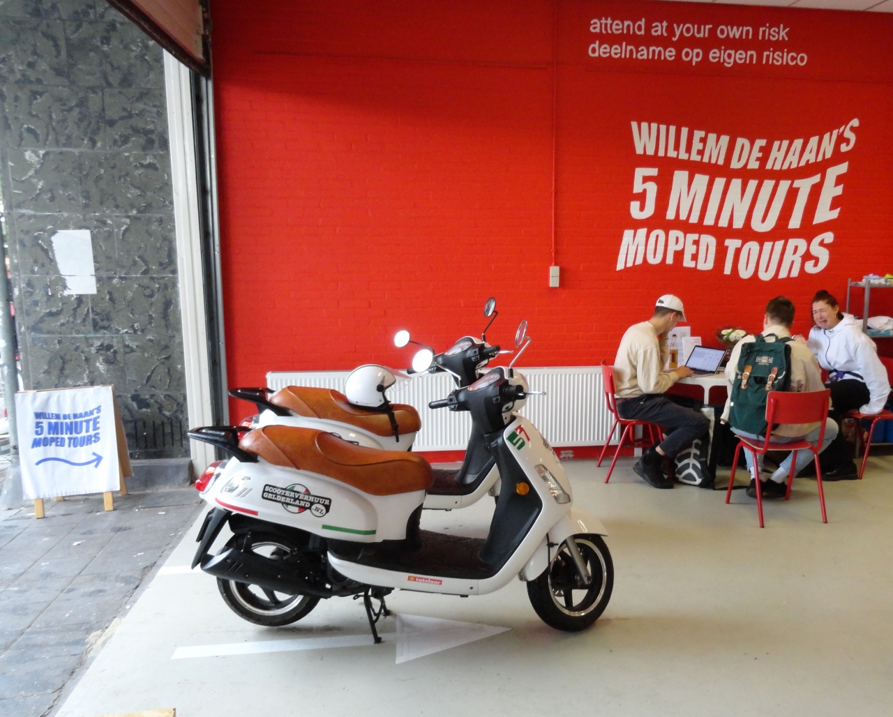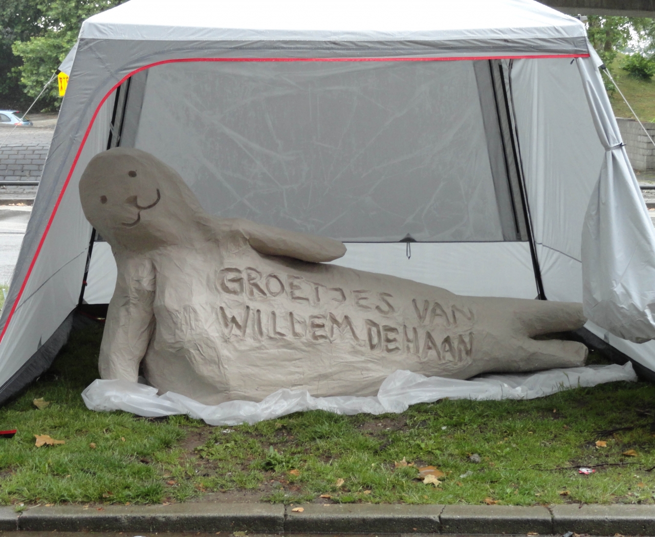 Mijn vriendin is moe. We worden uitgezwaaid door een koddige zeehond als we teruglopen naar de trein. De papier maché zeehond –waar klungelig een partytent overheen gezet is tegen de regen- blijkt later onderdeel te zijn van het afstudeerwerk van Willem de Haan. De Haan trekt zich niets aan van de muren van de academie en plaatst zijn twaalf werken in de publieke ruimte. Achterop een scooter wordt het publiek meegenomen naar zijn sculpturen en performances die onderdeel worden van het Arnhemse straatleven. Hét voertuig waar menig mens een hekel aan heeft, wordt nu de rode draad in een kunstwerk die iedere kunstliefhebber moet trotseren wil het de cynische, maar goed doordachte kunstwerken van De Haan bekijken.