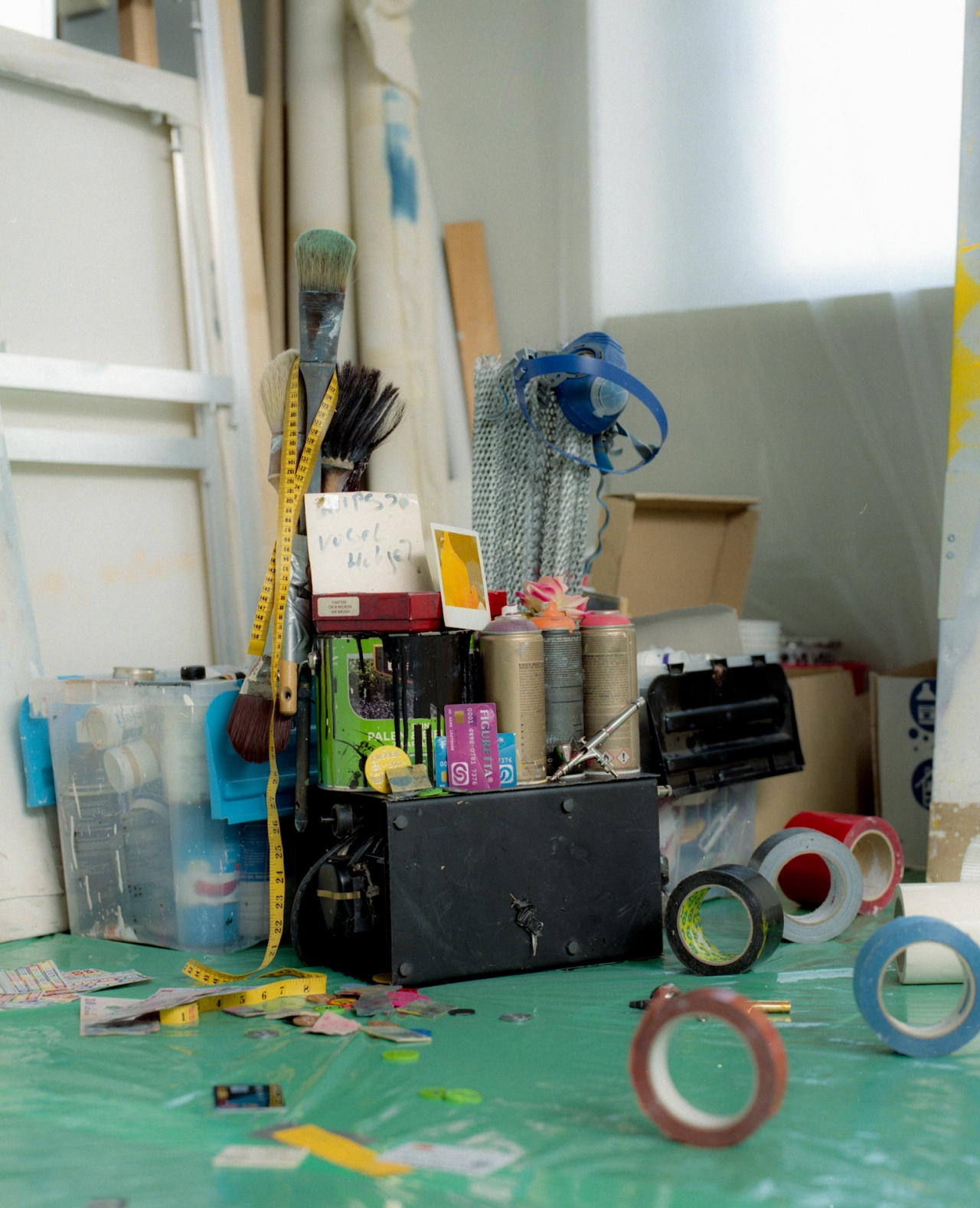‘In zekere zin voldoe ik niet aan de traditionele betekenis van wat een schilder is. Zo zit ik nooit voor een schildersezel te bedenken wat ik over wil brengen. Een wit doek bevat geen referentiekader en bevat alleen de mogelijkheid tot toevoegen in plaats van verbeteren. Als ik aan een doek begin, pak ik een spuitbus die ik helemaal leegspuit. Meestal slaat het nergens op en maak ik het doek alleen maar zo lelijk mogelijk. Vanuit daar ontstaat de aanleiding om dingen te verbeteren, weg te halen, weg te schrapen, weer wit te maken. Dat is het moment waarop het gesprek begint tussen het doek en mij begint. Door verschillende materialen door elkaar heen te gebruiken ontstaat er frictie: olieverf gaat over in graffiti, collage-elementen worden toegevoegd die vervolgens weer worden weggesneden, siliconen, plankjes of foto’s worden geplaatst en schroeven worden door het canvas gepriemd. Het moet net een beetje pijn doen. Pas als het (bijna) klaar is, weet ik eigenlijk waar het werk over gaat en vallen de puzzelstukjes in elkaar.’