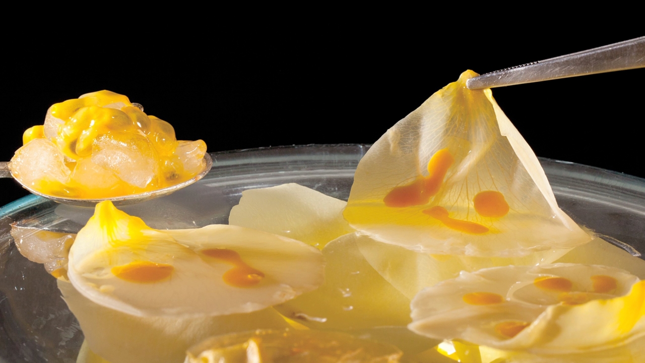 Hoenderfilet met warme gelei van saffraan bouillon en schuim van Parmezaanse kaas.