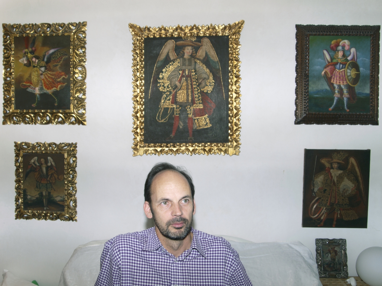 Rondwandelend in een museum in Salamanca, Spanje kwam Marc Pantus terecht op een expositie met kunst uit Cuzco, Peru. Daar ontmoette hij deze bizarre gewapende engelen. Een jaar later zag hij soortgelijke werken op een vlooienmarkt in Madrid en kocht ze meteen. Pantus dacht iets volkomen unieks in huis te hebben gehaald maar toen hij op een regenachtige zondagmiddag ‘engelen met geweer’ googelde kwam hij erachter dat je deze vreemde engelen gewoon via het internet kon bestellen. ‘Angeles arcabuceros’. Na de eerste teleurstelling sloeg hij aan het verzamelen. De schilderijen zien er oud uit, ze zijn gerafeld of gebladderd maar hun werkelijke leeftijd is moeilijk na te gaan.