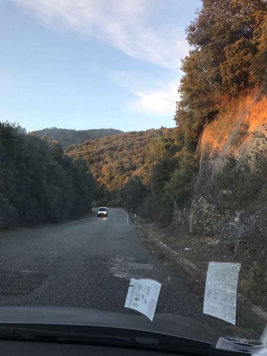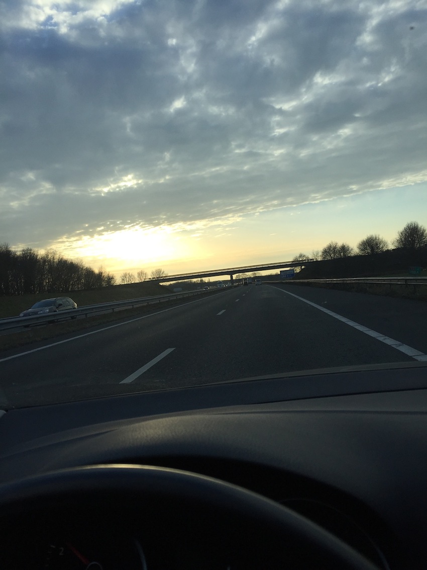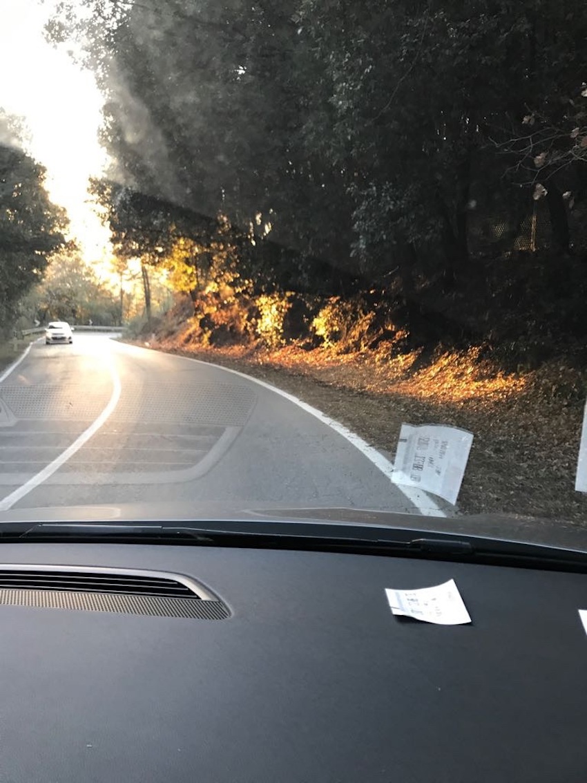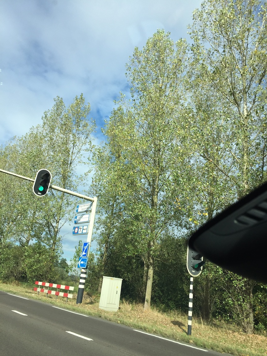 Het is vaak onderweg dat ik zie wat ik zal schilderen. Dan maak ik er een foto van, of ik vraag het Maurice, want meestal zit ik achter het stuur. Zo kan ik het beste de vorm onthouden. Hoe de foto er uitziet doet er verder niet toe. De kleuren komen er vaak pas later bij, soms uit een ander moment. Die schrijf ik dan liever op.