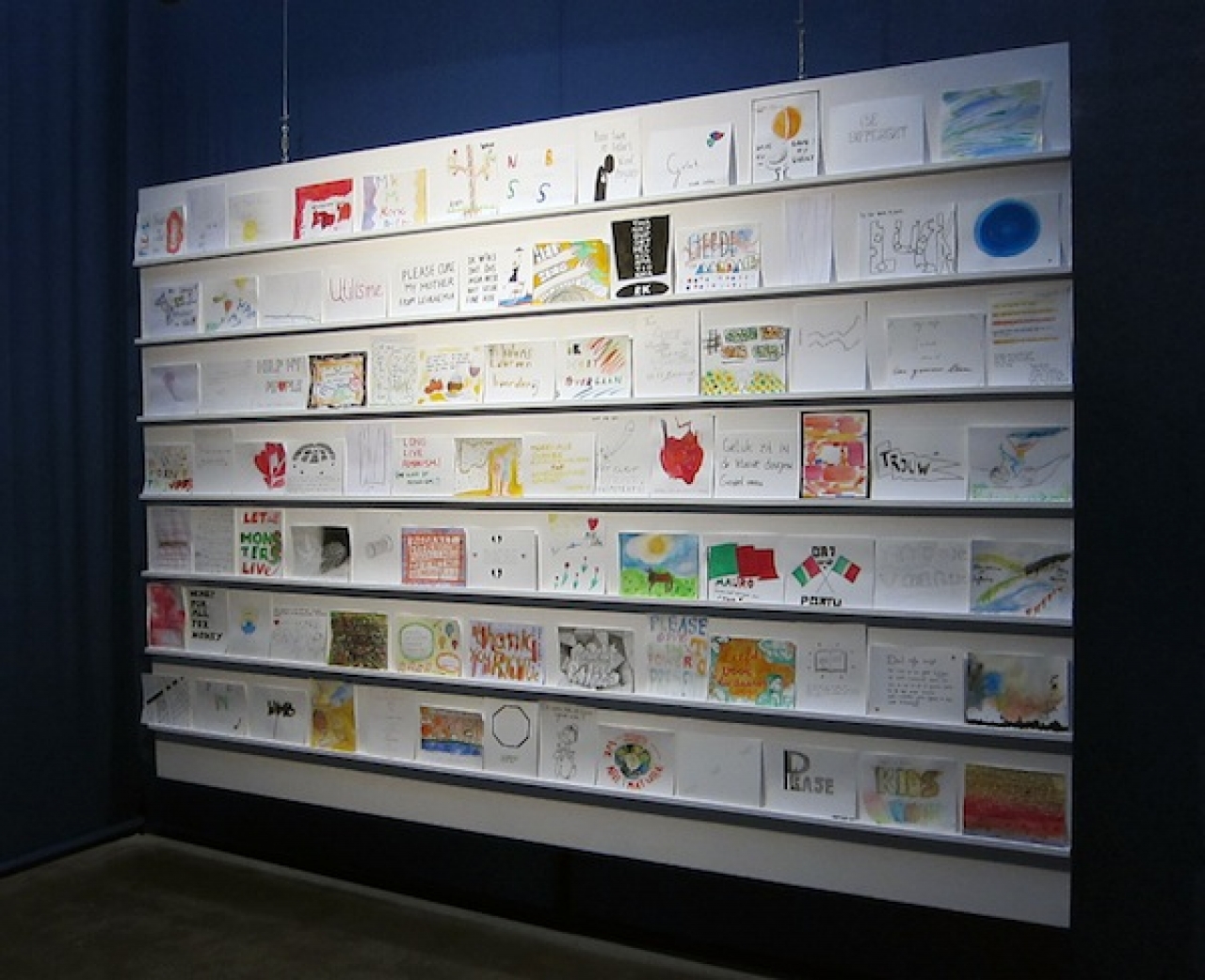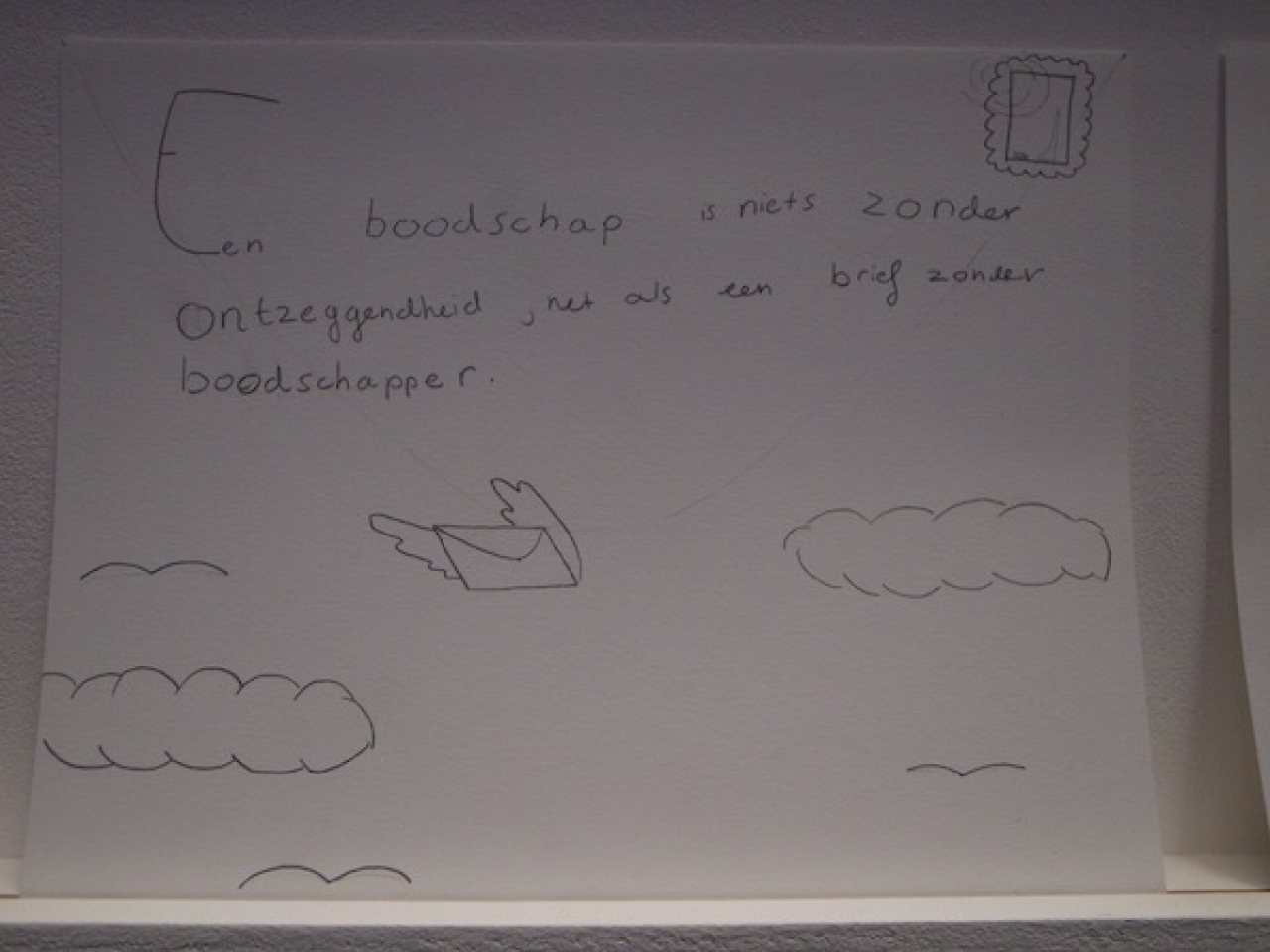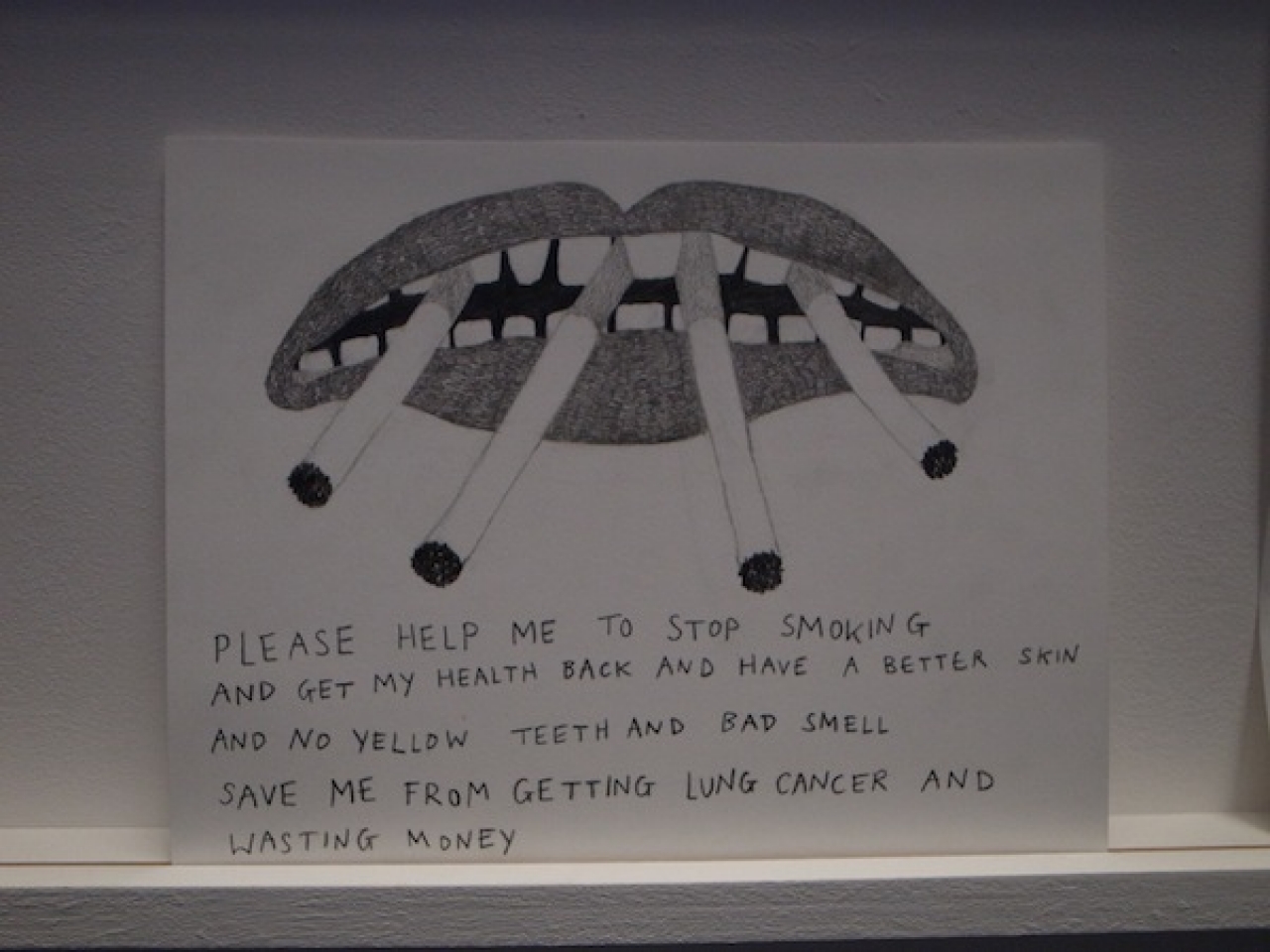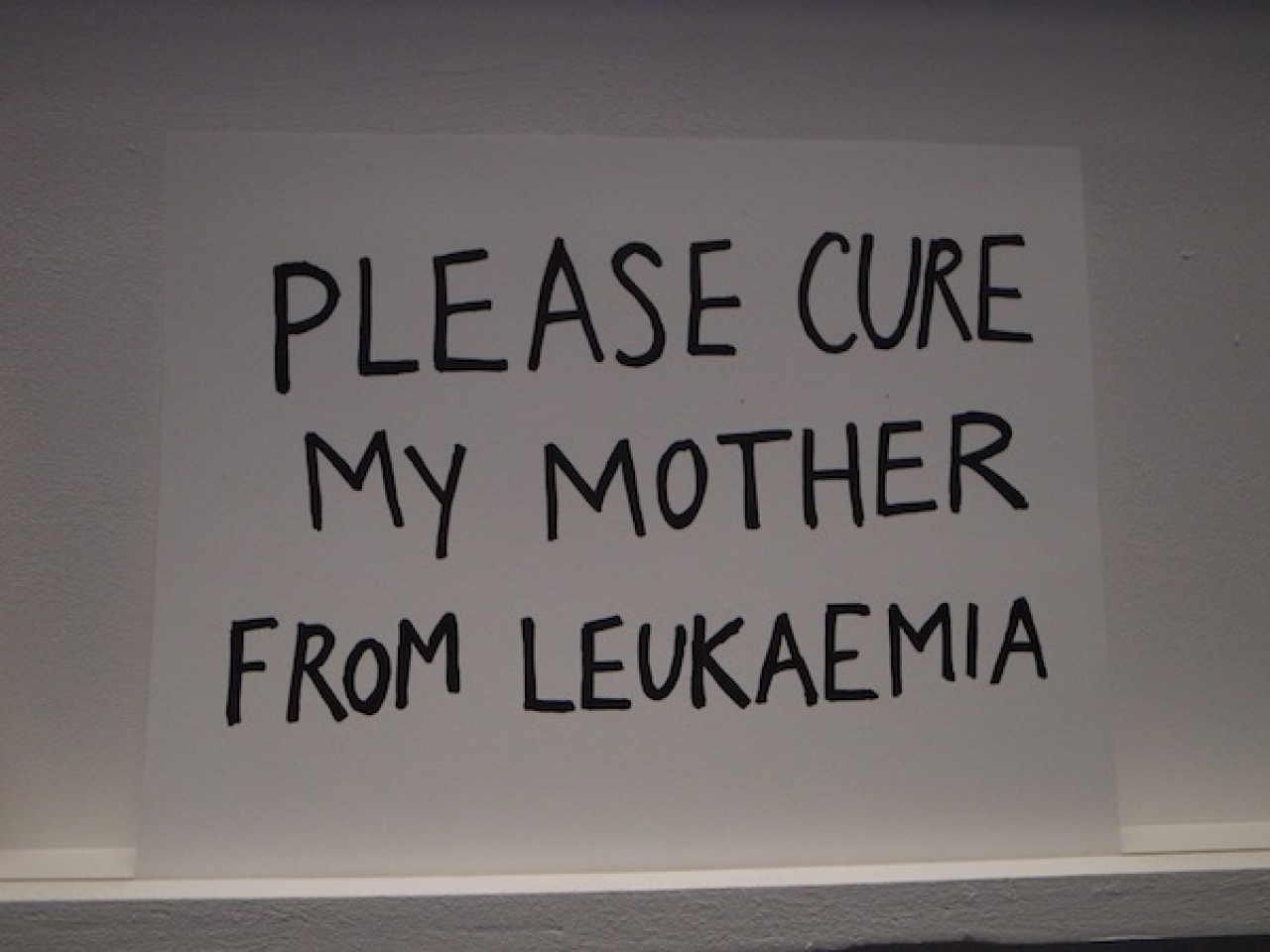 De tekeningen die in het blauwe afgeschermde hokje zijn geplaats wisselen sterk van urgentie, naast ‘Cure my mother of leukaemia’ hangt een tekening met een vraag om meer geld begeleid door een tekening van Guus Geluk. Een ex voto maak je altijd vanuit een urgentie, een dringende kwestie. In The Higher Office is het naast de ernst ook ruimte voor lichtvoetigheid. In deze rationele wereld zijn we niet meer gewend aan het zelf maken, er is weinig ruimte voor rituelen en magische handelingen. We hebben er geen tijd meer voor.