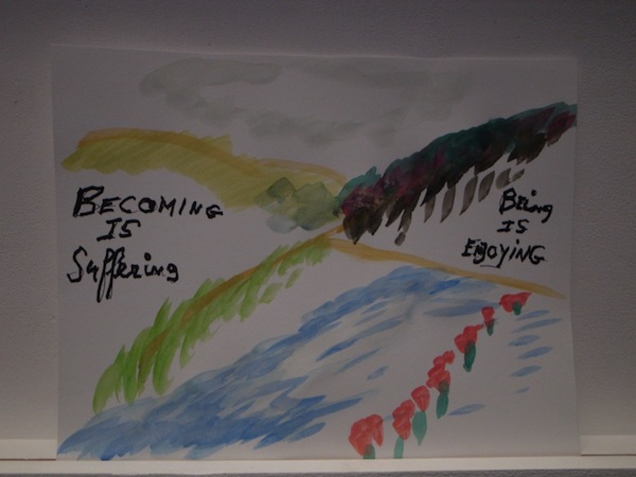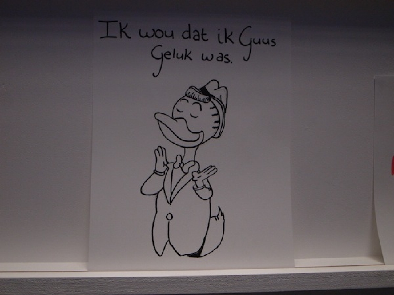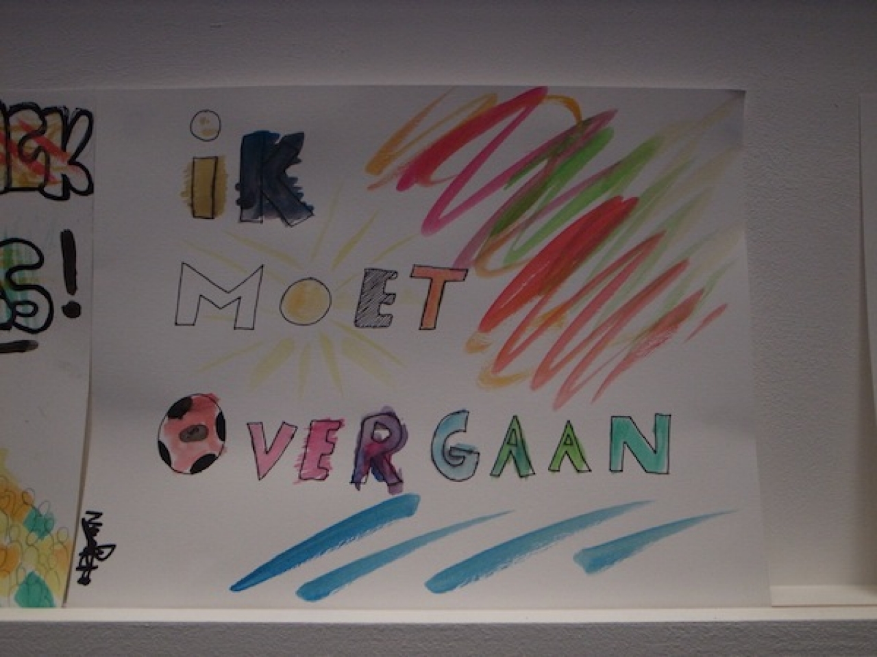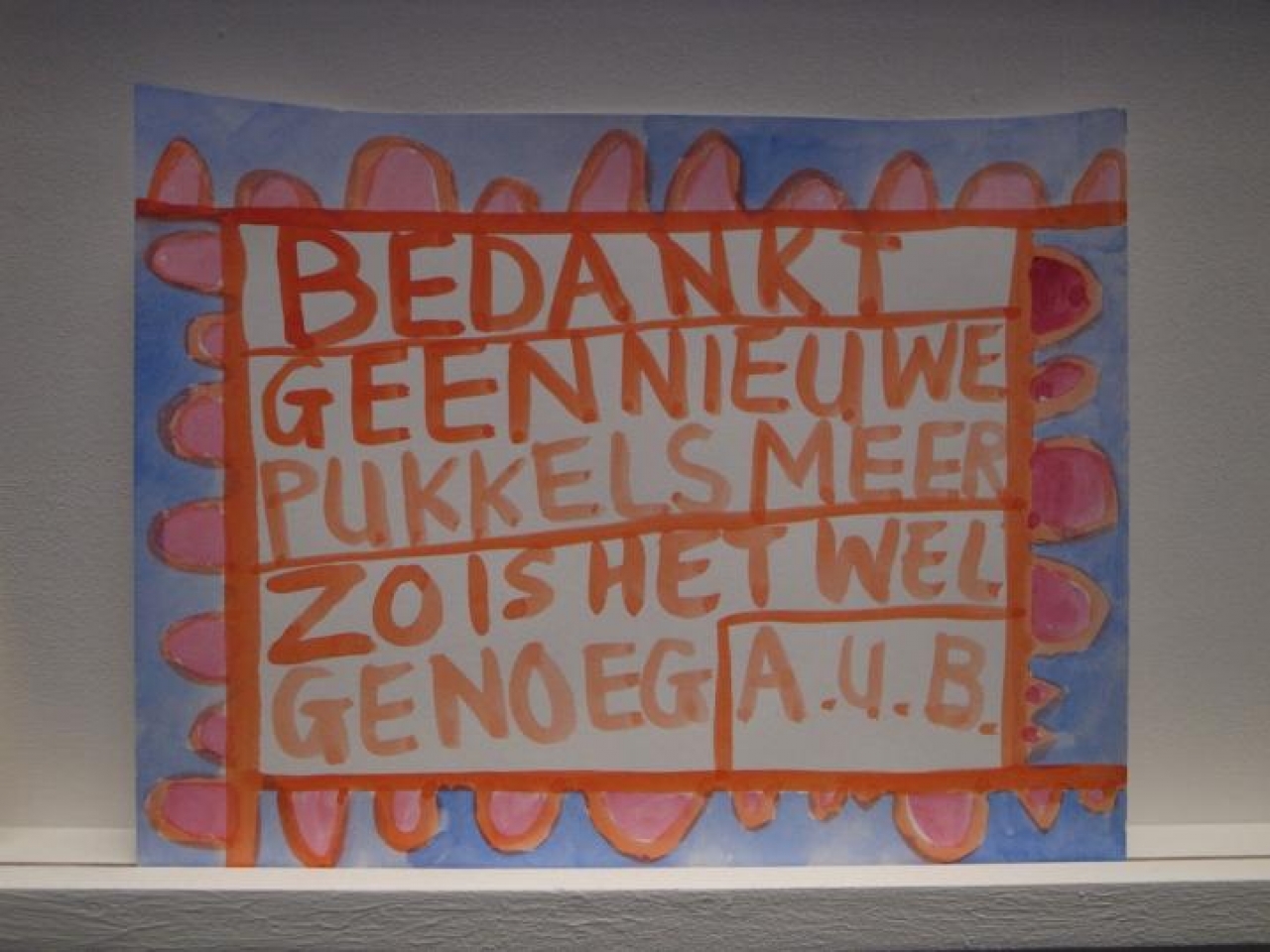 De tekeningen die in het blauwe afgeschermde hokje zijn geplaats wisselen sterk van urgentie, naast ‘Cure my mother of leukaemia’ hangt een tekening met een vraag om meer geld begeleid door een tekening van Guus Geluk. Een ex voto maak je altijd vanuit een urgentie, een dringende kwestie. In The Higher Office is het naast de ernst ook ruimte voor lichtvoetigheid. In deze rationele wereld zijn we niet meer gewend aan het zelf maken, er is weinig ruimte voor rituelen en magische handelingen. We hebben er geen tijd meer voor.