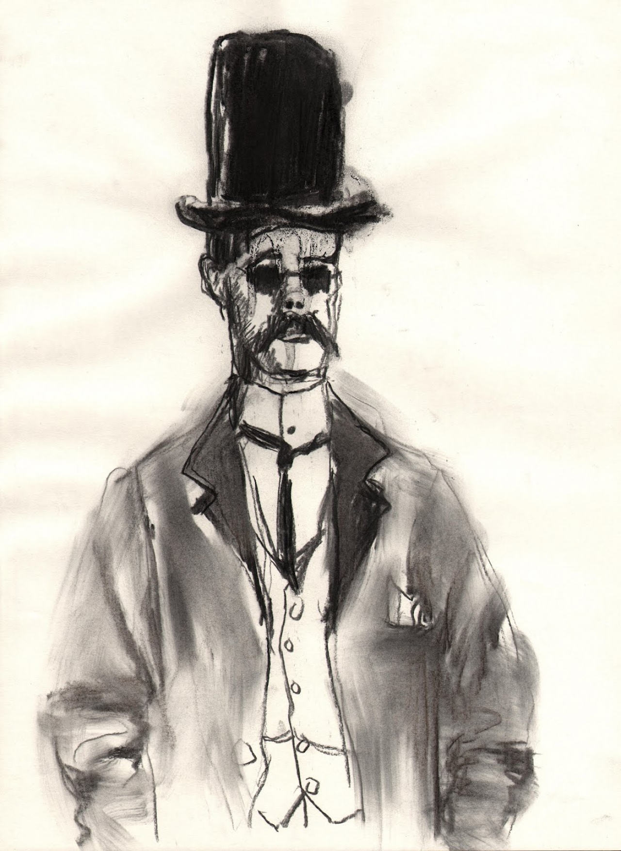 Een man met hoge hoed en een zonnebril, is de onbewogen toeschouwer, hooghartig kijkt hij naar al die vreemde buitenissige figuren.