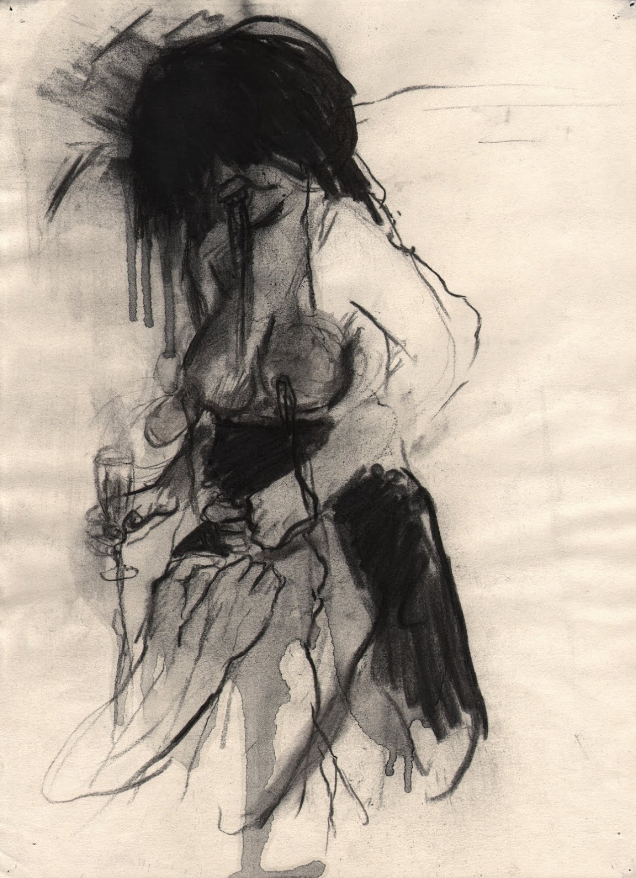 ‘Ik wil mensen graag naakt tekenen ’zegt ze. Naakt als ‘zonder kleren, naakt als ‘in hun ware aard’. Die aard is veranderlijk, De waarheid laat zich in ieder licht weer anders zien.’ Ze tekent met dunne krijtjes lijnen als zinnen.