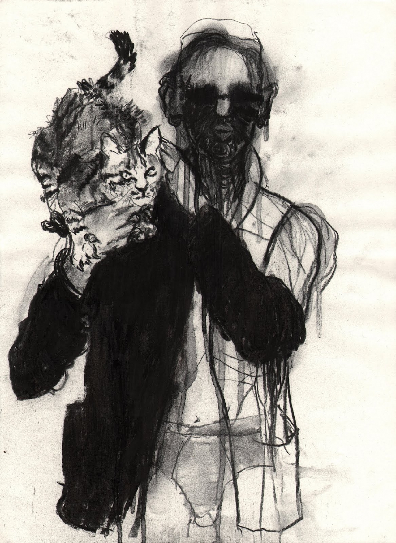 Ik kijk naar haar tekeningen, haar bloemen van uit elkaar vallende muffige verhuisdekenstof, waar treurige draden aan hangen, en naar de grote getekende liefdeszieke olifant. Hij zakt door z’n knieën van zieligheid. Als in een burleske cabaretvoorstelling komt de lafheid der mensheid voorbij paraderen, een vrouw ligt voorover gebogen terwijl een hyena in haar achterste wroet, hij heeft zijn hele kop erin gestoken en eet haar van binnenuit helemaal leeg. Is dat het leven?