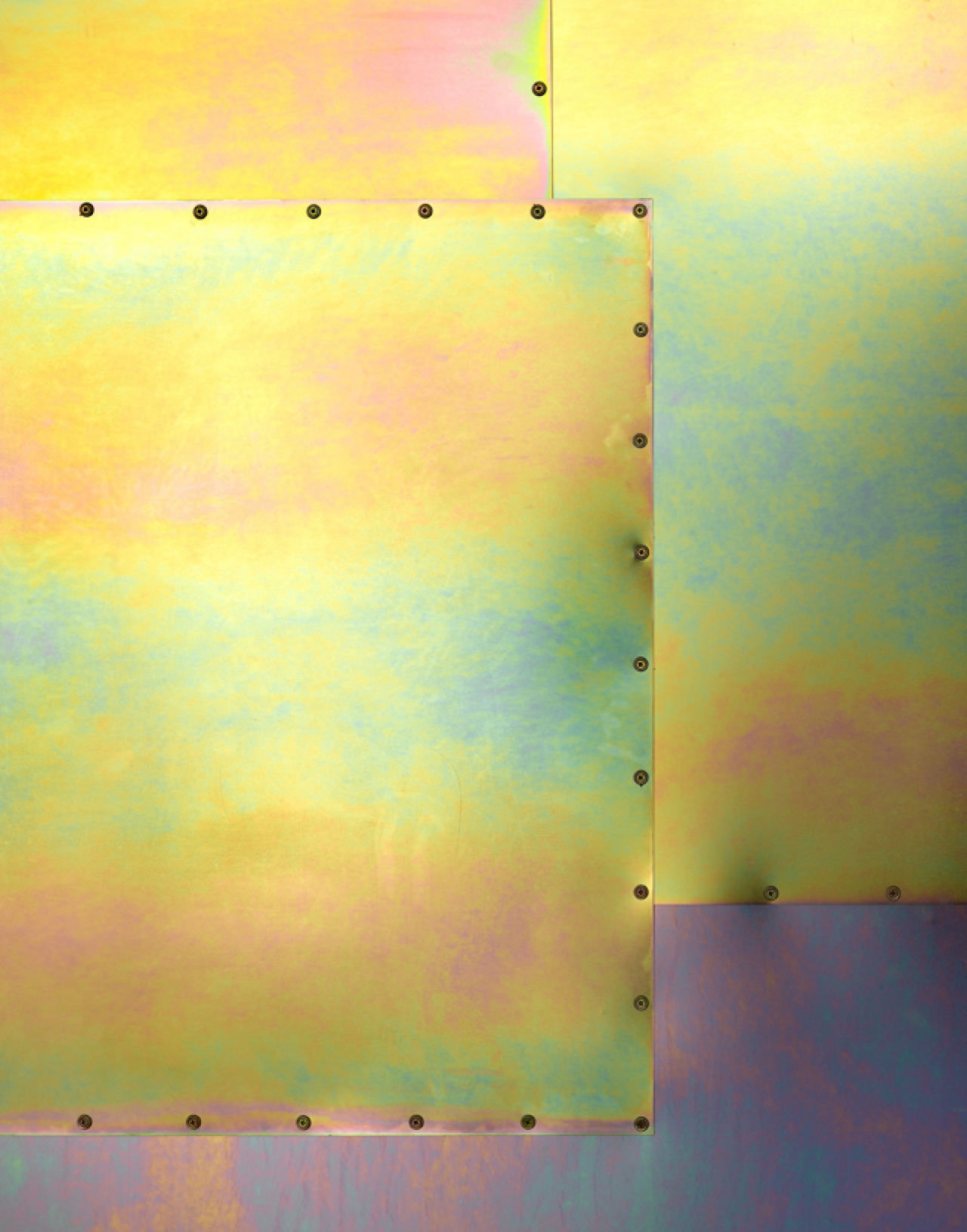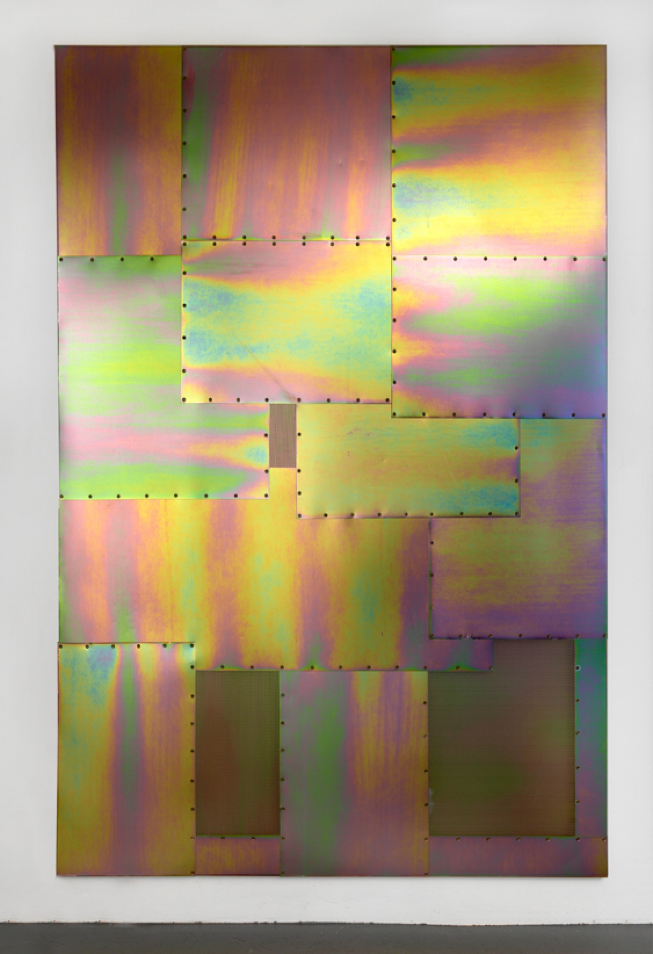 Mirrored on the opposite wall there are two metal wall sculptures of the same dimensions. The metal sheets are organised in a patchwork, merged by a rhythmic pattern of rivets. The metal components have been trough an industrial electroplating process. Each reflective sheet of conductive material has been immersed into 20 different baths, normally used to preserve the material from corroding and normally only applied to small parts such as screws with a hidden or peripheral function. As a side effect, this treatment delivers an unpredictable and multicoloured patina.