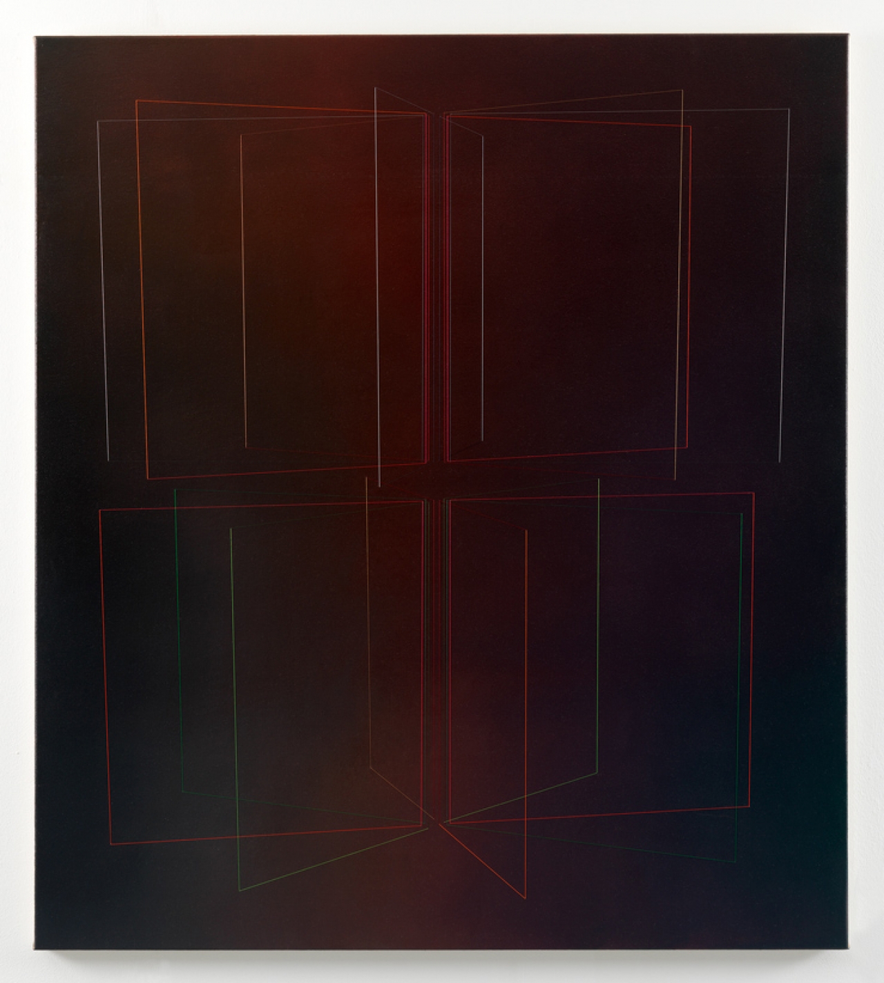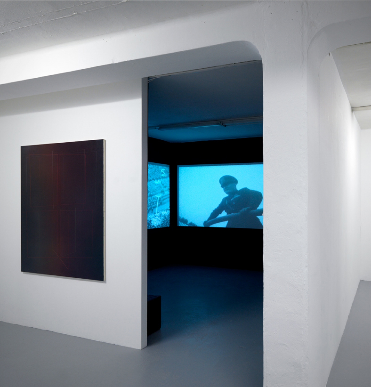 The front space of the gallery is symmetrically organised. Two opposite walls show similar size works, though executed in different media. The large-scale diptych painting titled Stigmata has a rich, deep, almost ethereal quality of surface and yet presents an uncanny similarity of form. Under close inspection it becomes apparent that one of the paintings is in fact a copy of the other, a step-by-step re-enactment, revealing evidence of a strict and rational process.