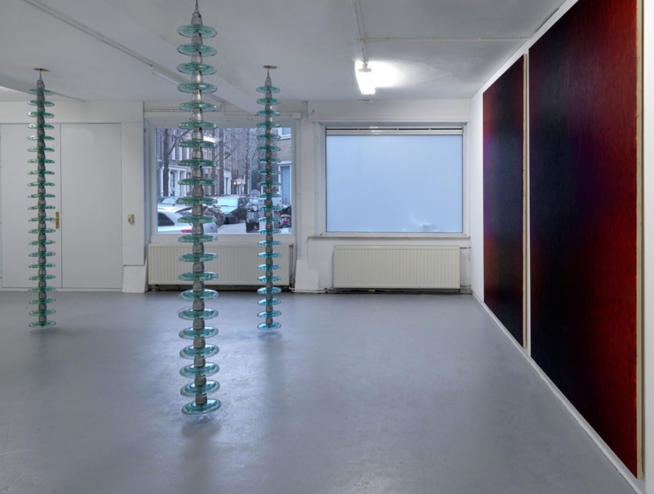 In the middle of the space, four columns of ready-made green objects are ominously hanging from the ceiling. These unusual totemic objects are made of glass disc insulators with non-conductive properties, normally used in high voltage transmission towers obstructing the currency. Presented as static transparent objects, taken out of their peripheral context, they form a new central space in the exhibition.