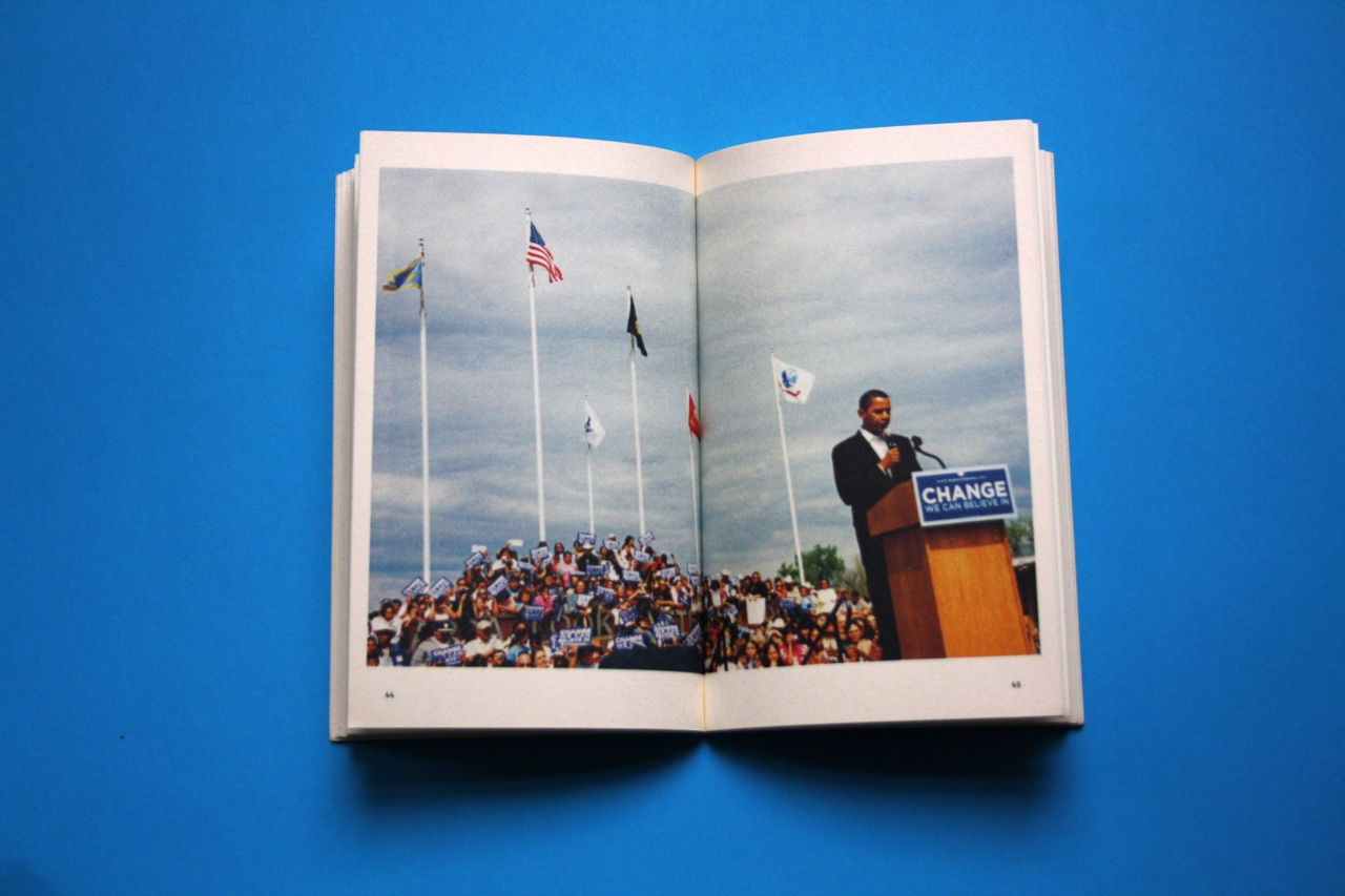 Al bladerend bekruipt je de vraag wie deze mensen zijn en waarom zij belangrijk geacht worden. Deze nieuwsgierigheid wordt beantwoord met een foto van Obama tijdens zijn verkiezingsperiode. Achter de sprekende president wapperen vlaggen hoog aan hun stok en houdt een aandachtig luisterend publiek donderblauwe borden omhoog met de tekst: ‘Change we can believe in’. Het verhaal achter deze foto blijkt minder hoopgevend: op het moment van deze speech wordt Barack Obama bedreigd met de dood. Welke persoon in de menigte is een onschuldige figurant en wie een potentiële crimineel?