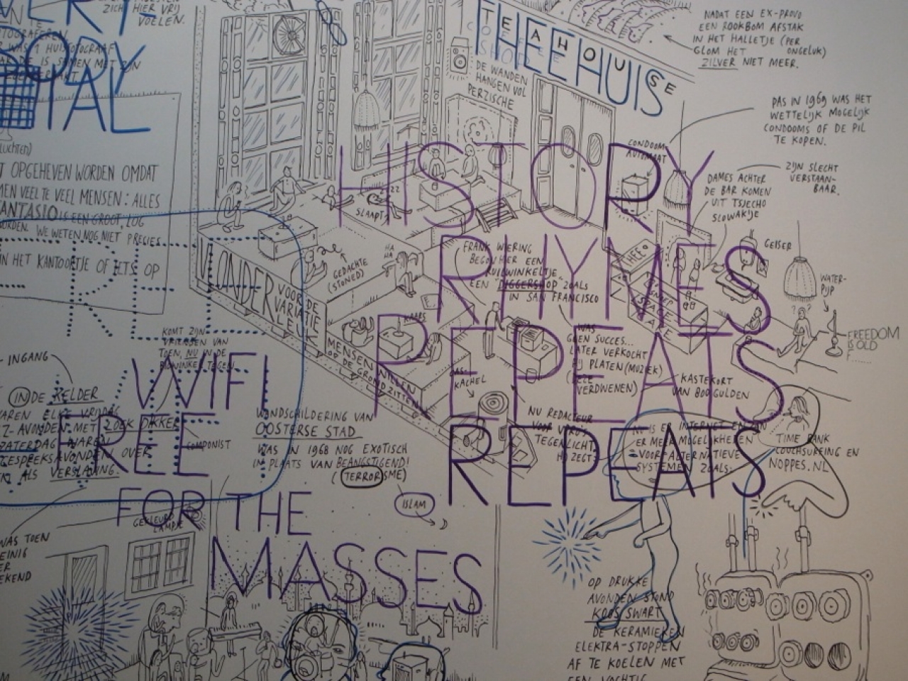 De curatoren hadden de situationisten als uitgangspuntgenomen maar waren niet in de stad gaan dwalen, zoals de situationisten maar In de tentoonstelling wordt een radicale erfenis verkend aan de hand van een belangrijk historisch non-event, een tentoonstelling van de Situationist International die nooit heeft plaatsgevonden. In 1959 schreven de Situationisten een voorstel aan directeur Willem Sandberg om een labyrint te bouwen in het Stedelijk Museum. Op papier klonk het allemaal heel spannend, alsof de Appel tot een groot levend en briesend organisme was omgetoverd. Ik zag een een buik die als een zelfstandig object inademde en weer uitademde, er was atelier waar iemand een verbeterde verise van de aanwezige kunstwerken voortselde, er waren magische zwarte bollen van Justin Gosker, een fantastische tekening van Jan Rothuizen maar de wereld waar we in leven, het kloppend hart, bleef buiten de muren van het instituut. Veel kunst over kunst.