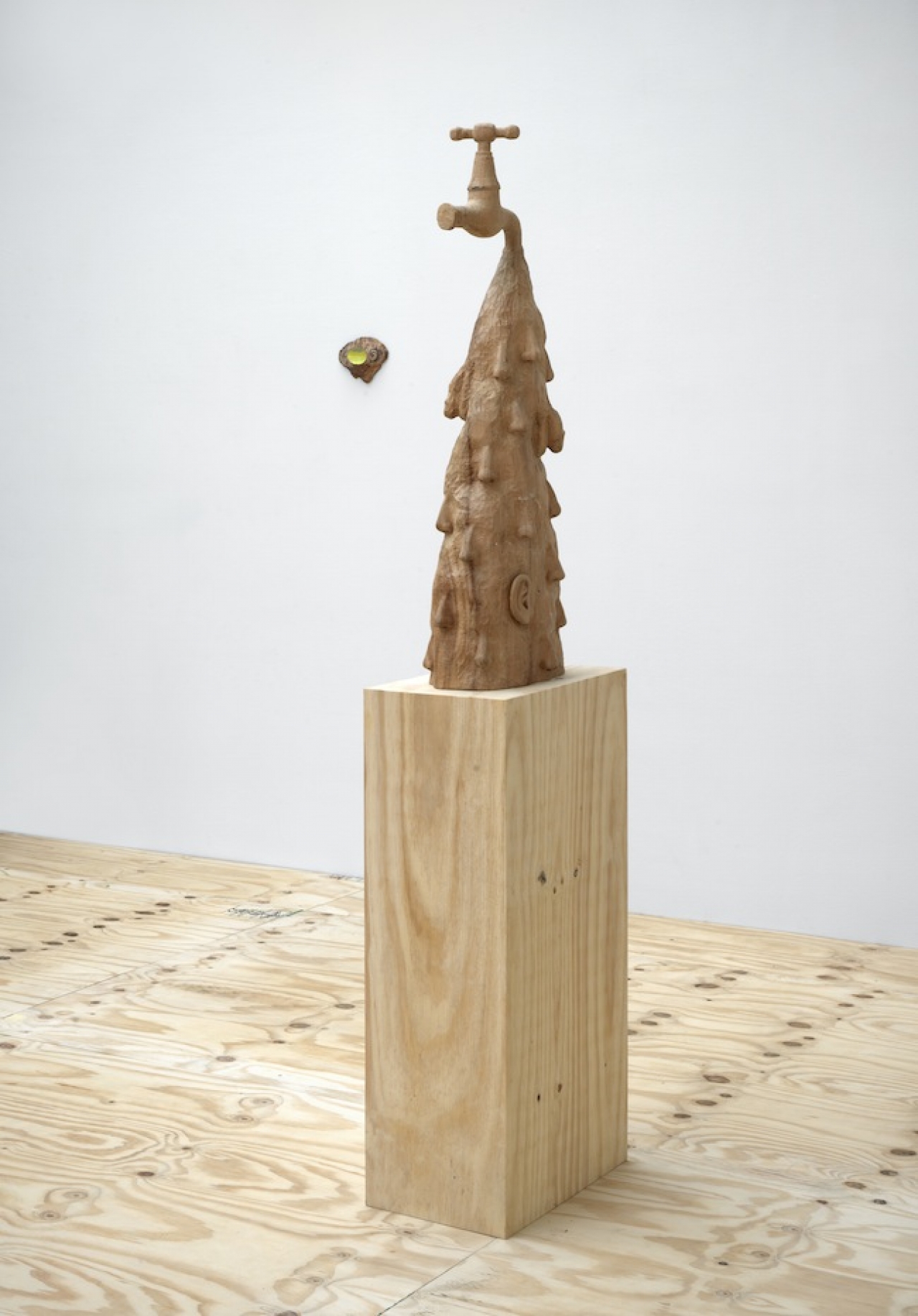 Ongemak van de Redelijkheid bijvoorbeeld is een kleine, bijna ovale vorm van hout waar een holte in is gehakt en die geel gekleurd is vanbinnen. Aan de zijkanten van het gele gat zijn een linker en een rechter oor gebeiteld. Het is geen hoofd, het is geen fictieve geest, het is een zo autonoom werk dat ik er voortdurend naar terugkeer, omdat ik denk dat me iets ontglipt aan betekenis, en het ontglipt me telkens weer, maar het houdt me bezig. Zoals dat ook gebeurt met die merkwaardige houten ‘Babylonische’ toren. Het geheel is uit een flink blok hout gehakt, een kraan bovenop, die iets lijkt te laten wegdruppelen, een conische vorm met vele neuzen en enkele oren. Alles stroomt, maar is gestold in hout en de illusie is vormgegeven.