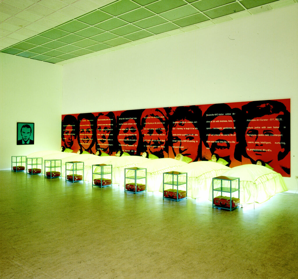 In de laatste zaal van Forever Young zien we vrouwen op bedden liggen, twee rijen aan weerszijden, is dit een slaapzaal of een mortuarium? De man op het doek dat achterin de zaal hangt, kijkt ons boosaardig aan. Boven de Sleeping Beauties – speciaal voor deze expo compleet gerestaureerd, allemaal naar het gezicht van Lydia Schouten zelf gemodelleerd, staan hun contactadvertenties, waar de man die daar hangt op heeft gereageerd, waarna ze nooit meer wakker zijn geworden. De Boston Strangler schudt ons wakker, in deze groen verlichte ruimte. Gemaakt voordat er een woord voor ‘femicide’ bestond.
