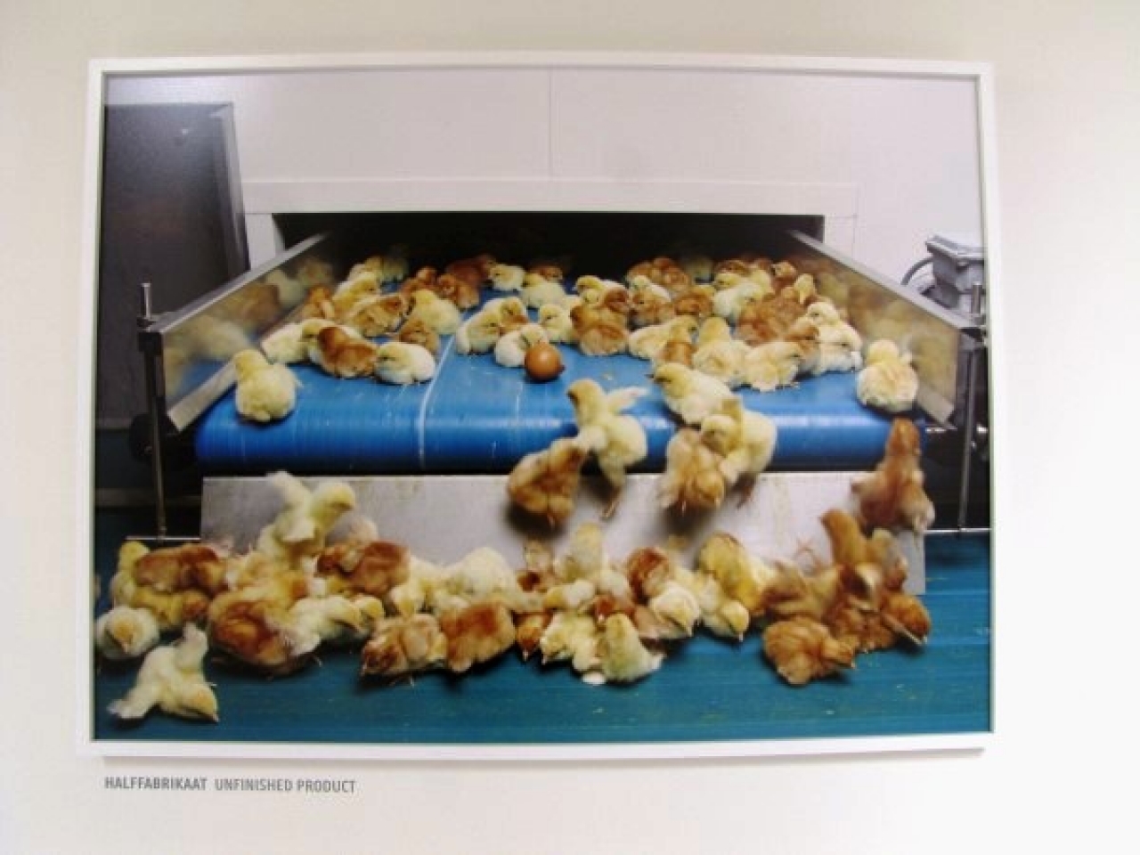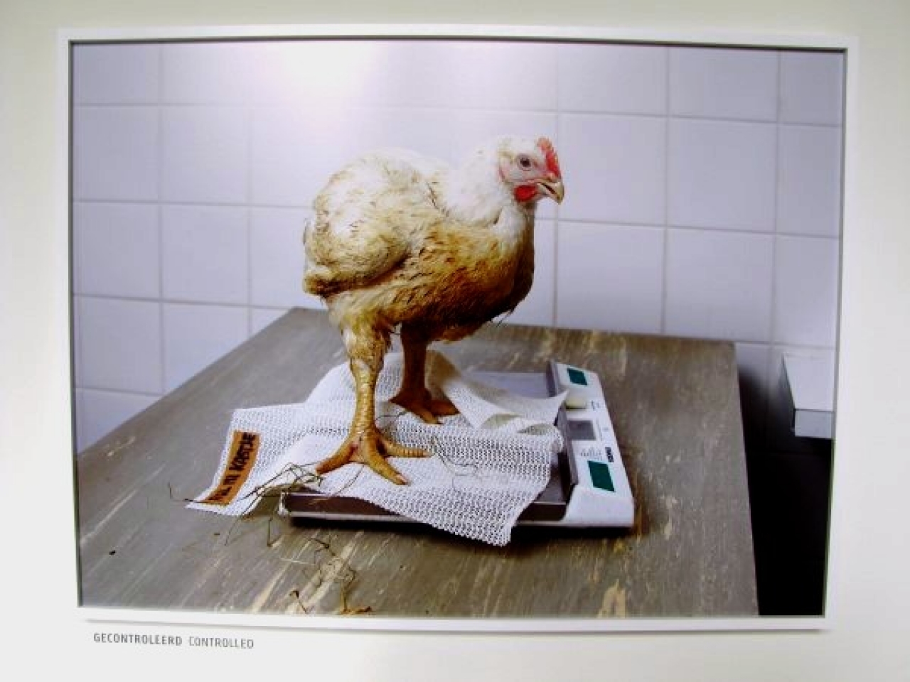 Dat ons koopgedrag een grote invloed heeft op ons voedselsysteem, is een andere ontdekking van de fotograaf. We staan er niet altijd zo bij stil, maar we zijn zelf onderdeel van het hele systeem, want onze vraag naar voedsel moet immers beantwoord worden. Dit is voor Wildschut ook een van de redenen geweest om dit te fotograferen, hij wil mensen hier bewust van maken. Daarom liggen er bij de tentoonstelling boekjes met teksten waarin de foto’s worden uitgelegd. Toen ik de foto’s in eerste instantie bekeek, vond ik het niet direct geruststellend te noemen: kuikentjes die via een lopende band worden verplaatst, een laboratorium waar paars licht schijnt en de planten zijn aangesloten aan een infuus, een rek vol kalfslevers en een schap vol bloedmonsters van verschillende soorten dieren. Toen Wildschut later het verhaal achter de foto’s vertelde, viel het me mee. Zelfs de foto van de plofkip, die ik eerder op posters van Wakker Dier had gezien, zag er ineens iets minder vreselijk uit dan daarvoor. Eigenlijk mag ik er ook niets over zeggen, want zelf koop ik ook de goedkope plofkip in de supermarkt. En velen met mij, want slechts 5 procent van de consumenten koopt biologische kip, maar als je vraagt wat men van de plofkip vindt, zal een veel groter percentage zeggen dat ze er tegen zijn. Wildschut: “De plofkip, of beter gezegd het vleeskuiken, wordt in een slecht daglicht gezet vanuit dierenwelzijn. Terecht want het is niet prettig om te zien. Maar toch zit het vast aan onze wensen om vlees te willen eten. Er wordt wel ander vlees aangeboden en er zijn veel mensen tegen de plofkip, maar slechts een kleine groep mensen zet dit om in ander koopgedrag. Een ander voorbeeld is het ontsnavelen van de kippen, wat ook wordt gezien als niet diervriendelijk. Tegenwoordig gebeurd dit met een laser, wat pijnloos zou zijn. Of het diervriendelijk is, ligt er maar net aan hoe je het bekijkt. Als je kippen met elkaar in de stal zet, gaan ze elkaar pikken, tot doods aan toe. Ze moeten toch met grote getallen in een stal, want we willen ook kip eten, dus er moet veel kip zijn. Je moet hierin dan toch een keuze maken.”