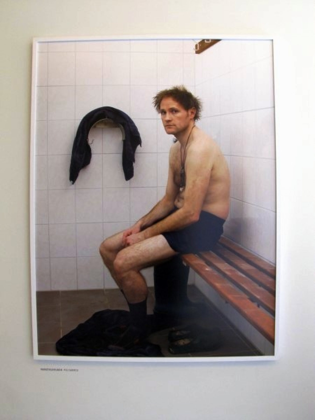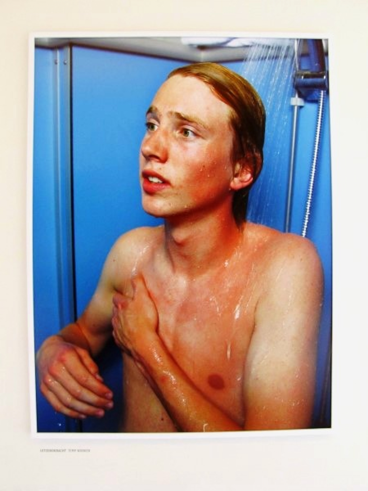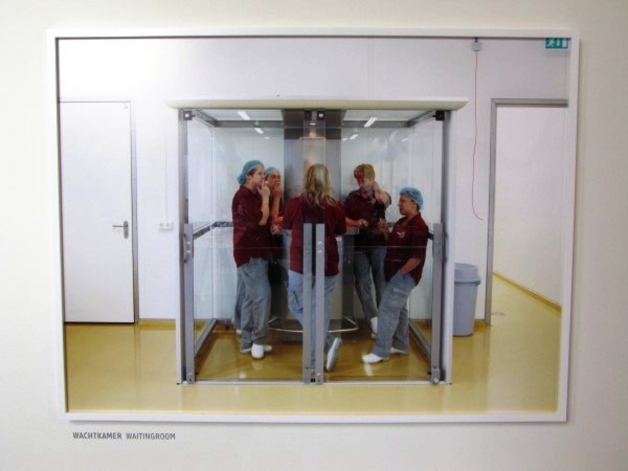 Een van de werken die te zien is, is een foto van een douchende uitzendkracht. De foto bevat sprekende kleuren die een mooie tegenwerking bevatten: de huid van de jongen heeft precies dezelfde kleur roze als de huid van biggetjes die op andere foto’s te zien zijn. ‘In-douchen’, noemt Wildschut het. Dit houdt in dat je, met name als je een varkensbedrijf binnenkomt, eerst moet douchen, dan pas mag je het bedrijf in. “ Ook ik moest eerst onder de douche. Daarnaast moest mijn apparatuur door een scanner, in een soort van grote doos met infraroodlicht, zodat het ontsmet kon worden. Daarna kreeg ik bedrijfskleren aan, al mijn eigen kleding moest uit, tot aan mijn onderbroek, sokken, alles. Dan pas mag je het bedrijf in. Voor mij was dit echt ongelooflijk.” Eerder heeft Wildschut een serie gemaakt over het AMC, in opdracht van de Volkskrant, waar hij fotografeerde in de operatiekamers. Hij gaf aan dat hij hier nooit heeft ‘in-gedouched’ of zijn apparatuur heeft moeten ontsmetten. Wildschut zelf denk dat dit cynisch genoeg te maken heeft met het economische belang, die voor een varkensboer voor groter is dan voor een ziekenhuis. Wildschut: “De boer moet heel goedkoop produceren en voldoen aan alle regels van voedselveiligheid om nu bijvoorbeeld het antibioticagebruik terug te dringen. Daarom moet hij op een extreme manier klinisch te werk gaan. Zo mag hij alleen in zijn eigen gebied werken en is het niet toegestaan om de varkens zomaar verplaatsen, want dan is er een besmettingsgevaar. Indien dit gebeurd, betekend het dat je antibiotica moet gebruiken, maar antibiotica geven aan dieren mag niet meer. Dit kan dus betekenen dat alle dieren dood gaan. ” Iedere verplaatsing, maar dus ook ieder persoon die van buiten naar binnen komt, vormt een groot risico. Op het moment dat het mis gaat zit er natuurlijk een groot financieel risico aan vast en is het mogelijk dat zo een bedrijf failliet gaat. Dit komt volgens Wildschut omdat de marges heel klein zijn, wat als oorzaak heeft dat wij als consument daar niet meer voor willen betalen.
