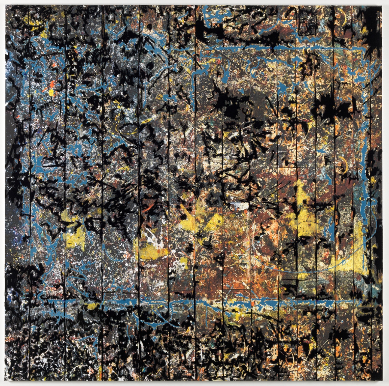 BS: ‘In de kern is er niet zoveel veranderd, dat kun je niet veranderen. Maar naarmate ik ouder word, word ik wel steeds preciezer. Ik heb nu bijvoorbeeld veel meer baat bij droge specifieke feiten in mijn onderzoek naar andere kunstenaars dan dat ik vroeger had. Om nog even bij Pollock te blijven: vroeger vond ik vooral zijn leven romantisch. Het verhaal van de zuipende kunstenaar die in de openhaard piste en in een trance aan het werk was. Dat zijn natuurlijk anekdotes waar je niets van leert. Nu vraag ik mij veel meer af wat er nou precies is gebeurd. Waarom heeft Pollock zijn kwast opzij gelegd en is hij gaan druppelen? Hij had bij wijze van spreken die drippings ook gewoon kunnen schilderen. Zelf denk ik dat het iets te maken heeft met het experiment en de antropologie. Indianen maakten tekeningen met zand door het door hun vingers omlaag te laten glijden.’