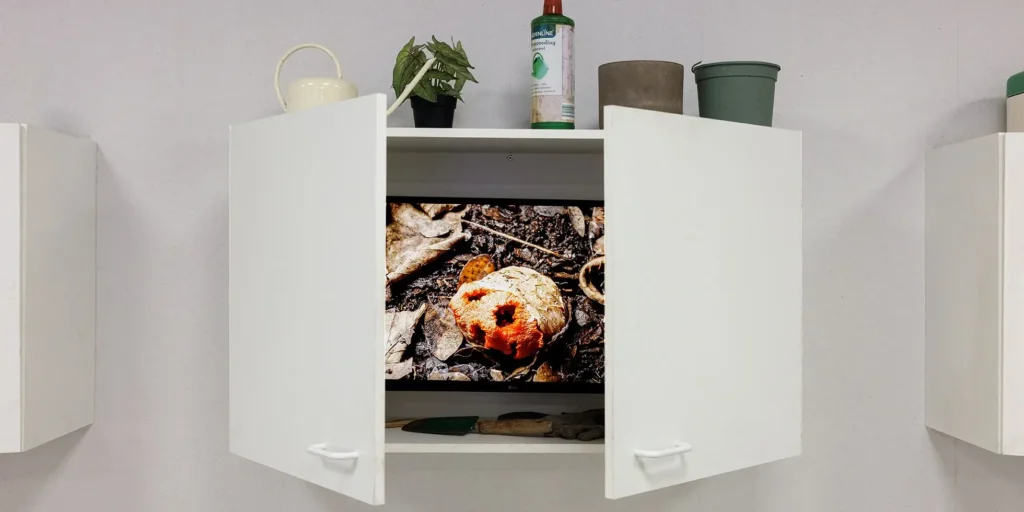 De curatoren maken expliciet dat ze schimmels niet willen voorstellen als nieuwe grondstoffen of oplossingen, maar – zoals de ondertitel suggereert – als ‘anarchistische ontwerpers’ en ‘onafhankelijk opererende wereldbouwers’ die zich weinig aantrekken van menselijke ambities tot beheersing. Op die manier willen ze afstand nemen van een bepaald type fascinatie binnen design en architectuur, die vooral in functie staat van menselijke toepassingen en zo schimmels tot een hip, inzetbaar biomateriaal promoveren. In plaats daarvan leggen Tsing en Zhou de aandacht op de manier waarop schimmels zelf hun omgeving vormgeven, verbindingen aangaan en hele leefwerelden opbouwen, zonder dat dit gericht is op nut of efficiëntie voor ons. Het parcours ordent die uiteenlopende rollen thematisch, in zalen rond verval, besmetting, samenwerking en herstel, waardoor een beeld ontstaat van een wereld waarin leven niet voortkomt uit controle of planning, maar uit voortdurende interacties tussen soorten, processen en omstandigheden die elkaar wederzijds mogelijk maken.