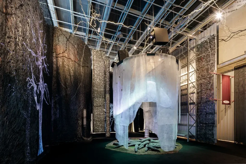 Van het monumentale worteltapijt van Diana Scherer tot de sferische microscopische schimmelfoto’s van Suzette Bousema en de organische kartonnen lichamen van Maartje Korstanje, verspreid door de ruimte en langs de muren, schakelt de tentoonstelling in CODA voortdurend tussen schaal en benadering. De abstracte software-omgeving van Driessens & Verstappen en het acht meter brede wandtapijt van Otobong Nkanga trekken dat spanningsveld nog verder uiteen in een veld van abstractie en figuratie, technologische verbeelding en historische resonantie.