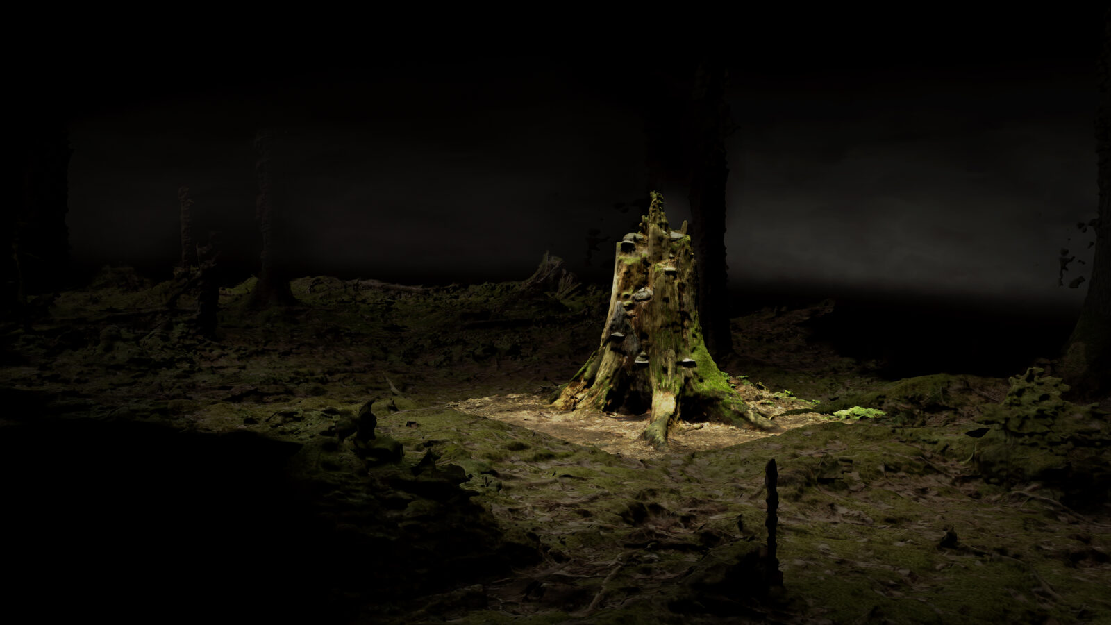 De fragiele realiteit van het bos uit de buitenwereld komt terug in de instabiliteit van de digitale modellering. Het woud oogt soms dicht en beschut, dan weer uiteenvallend in losse boomfragmenten, bladerlagen en licht, alsof het elk moment zijn samenhang kan verliezen. De illusie blijft intact zolang je erin blijft kijken, maar geeft zich tegelijk prijs als constructie: een leefwereld die alleen via bemiddeling toegankelijk is. Terwijl de zingende protagonist verder afdwaalt in een onheilspellende melancholie en vervreemding, valt het oerbos uiteen in zijn eigen digitale fragmenten; een werkelijkheid waarvan alleen een buitenstaander lijkt te kunnen inzien dat zij geconstrueerd is. Het is een betoverende ontmanteling waaruit ontsnappen moeilijk is, en waarin het nog moeilijker is geen spiegelbeeld van onze eigen positie te herkennen.