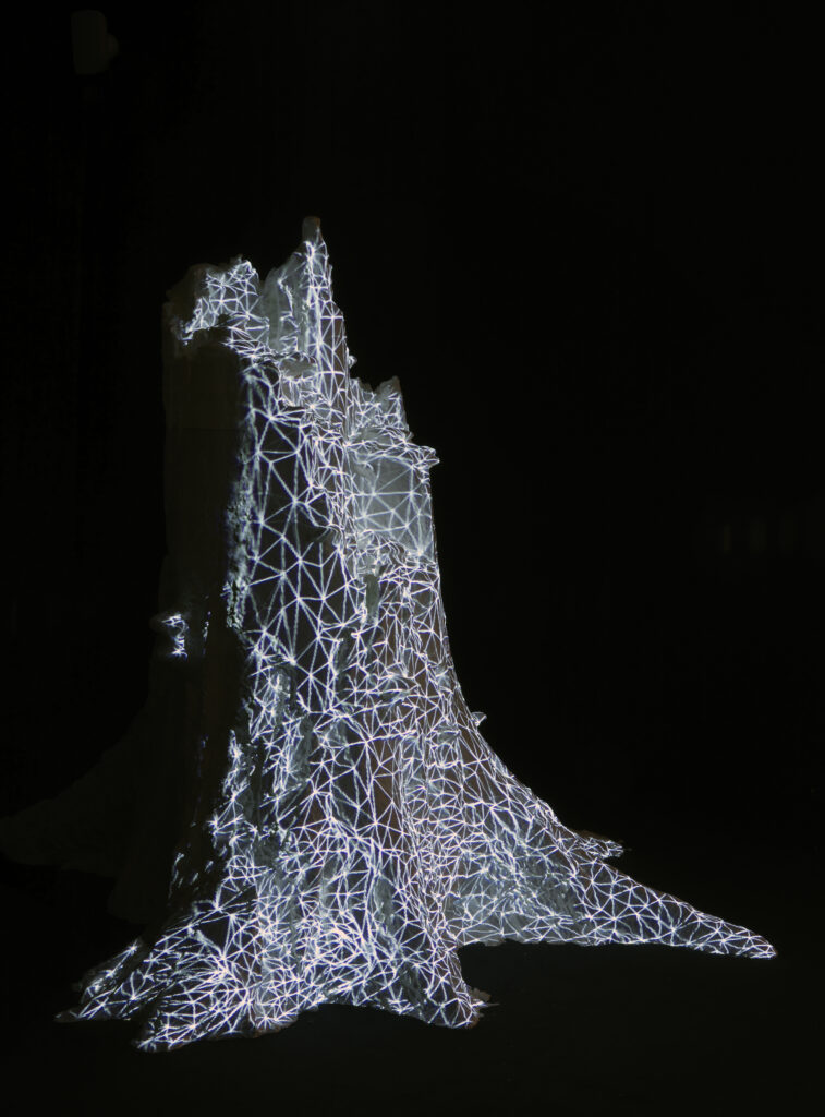 Die herhaling ligt op de snijtafel in het werk van Persijn Broersen en Margit Lukács, te zien in De paddenstoel aan het einde van de wereld. Hun video-installaties verkennen hoe digitale beeldvorming onze ervaring van de wereld niet alleen weergeeft, maar zou kunnen vormgeven, en hoe de vlakheid van fotografische oppervlakken kan omslaan in bijna vloeibare, ontregelende landschappen. Hun video’s en animaties transformeren stadjes, bossen en architectuur tot fragiele, gefragmenteerde omgevingen waarin werkelijkheid en virtuele representatie elkaars gelijken lijken. De beelden, vaak opgebouwd uit talloze fotografische lagen en digitale fragmenten, gegenereerd via point-cloudtechniek, tonen op een fascinerende manier hoe de visuele logica van schermen, modellen en simulaties elkaar laveert en ontwricht.