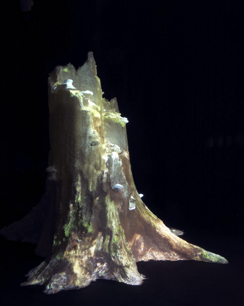 Schwayg Main Harts (2018) is een 3D-geprint model van de wortelkluit van een eeuwenoude boom uit het Białowieża-bos, een van de laatste oerbossen in Europa. Op het kunststoffen object wordt een video geprojecteerd van een bosrijke omgeving, die een voortdurende digitale metamorfose lijkt te ondergaan. Het oppervlak verandert daardoor voortdurend van gedaante, van een fotografische huid naar een technische ontleding, van schors en mos naar een opengewerkte wireframe-structuur. Door de projectie lijkt de boom langzaam om zijn as te draaien, als een digitaal model dat zich laat inspecteren. In plaats van een lichaam in een omgeving danst de boom in een simulatie die diens eigen manipuleerbaarheid en virtuele beperking toont. Die ontheemding krijgt een stem in het lied dat klinkt, een klaagzang over verlies en eenzaamheid, als een echo uit een landschap dat hier slechts als beeld aanwezig is. Losgemaakt van zijn ecologische en historische context en herleid tot een reproduceerbaar object dat kan worden opgeslagen en afgespeeld, raakt de boom aan een bredere ervaring van ontheemding: tussen mens en de rest van de levende wereld, tussen kijken en betrokken zijn. Hyperzichtbaar en tot in detail gemodelleerd blijft de boom een onbekende.