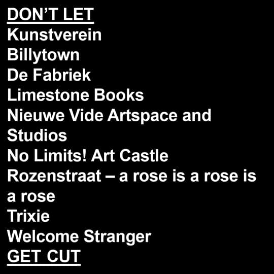 Kunstverein (Amsterdam), Billytown (Den Haag), Limestone Books (Maastricht), Trixie (Den Haag), Welcome Stranger (Amsterdam), De Fabriek (Eindhoven), Nieuwe Vide Artspace, Studios (Haarlem), No Limits! Art Castle (Amsterdam) en ROZENSTRAAT – a rose is a rose is a rose (Amsterdam)