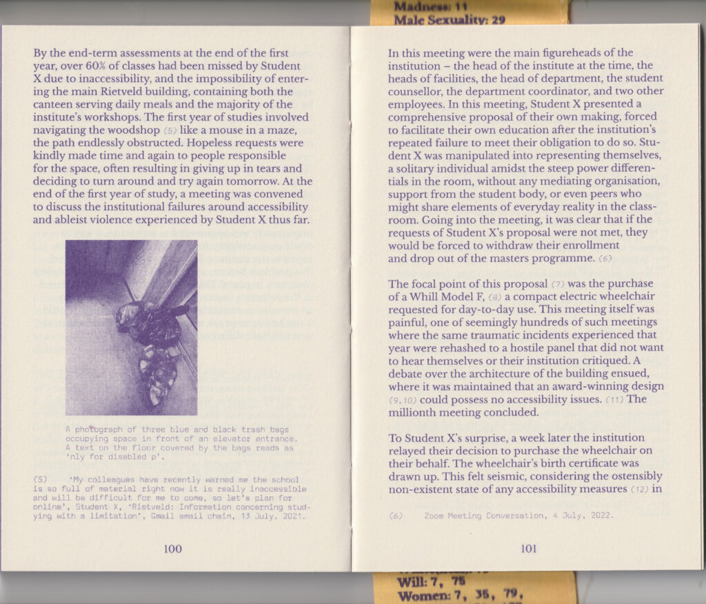 In 2023 woonde ik zelf één van jullie workshops bij van Park McArthur, Geelia Ronkina en Constantina Zavitsanos, allemaal kunstenaars gevestigd in de Verenigde Staten. Wat mij vooral is bijgebleven is het gesprek over de praktische randvoorwaarden van het makerschap als je rekening moet houden met toegankelijkheid. Er werden ervaringen uitgewisseld die betrekking hadden op hoe je kan functioneren als kunstenaar als het maken of installeren van je werk externe hulp vereist. Dit zijn gesprekken die op het hoger onderwijs niet tot nauwelijks gevoerd worden. Hoe kunnen we ervoor zorgen dat deze dialoog ook buiten deze kleine groep plaatsvindt?