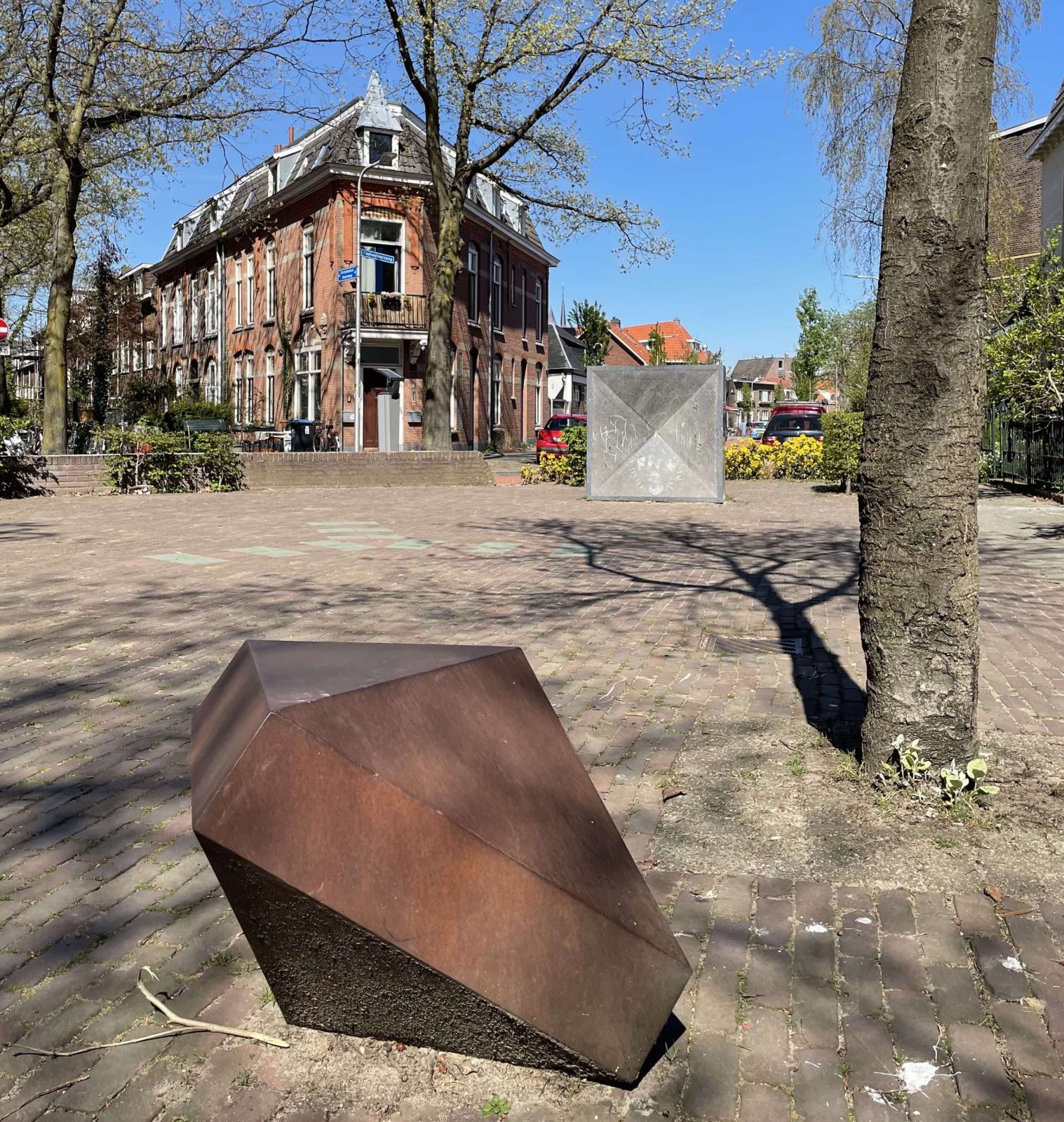 Van Lunteren werd gevraagd voor dit pleintje een sculptuur te maken. De kunstenaar is vooral bekend vanwege zijn werken in de publieke ruimte. Hij maakt regelmatig mathematische vormen die refereren aan de context van de locatie. In dit geval heeft de grote steen een naar binnen gekeerd kruis aan beide zijden als verwijzing naar hoe het werk is ontstaan: een kruispunt. Aan de overkant van de steen staat op het pleintje een kleinere metalen vorm, dit ziet de kunstenaar als een negatief van de ingedeukte steen. Waar de steen naar binnen steekt, steekt de metalen sculptuur juist naar buiten.