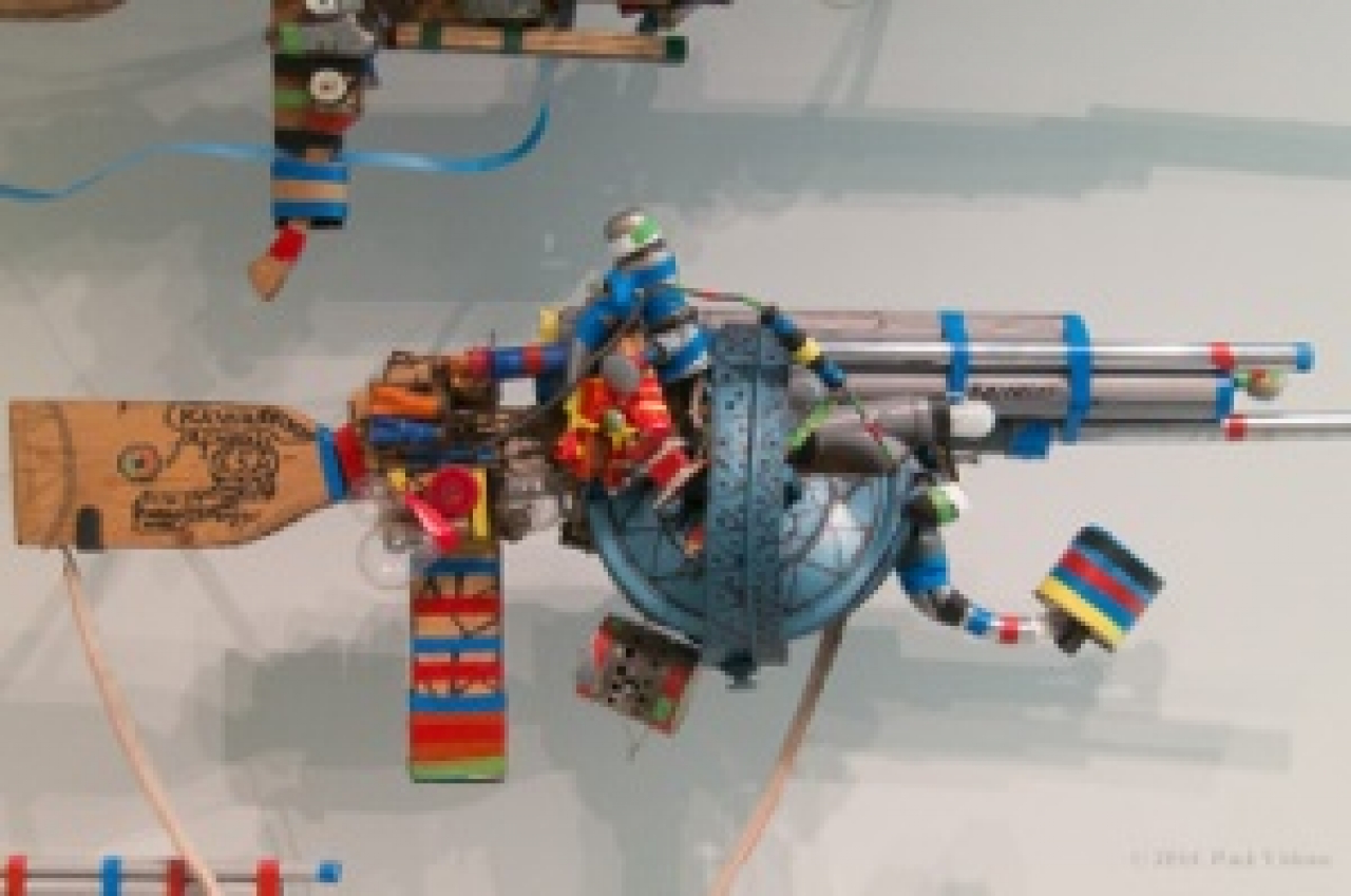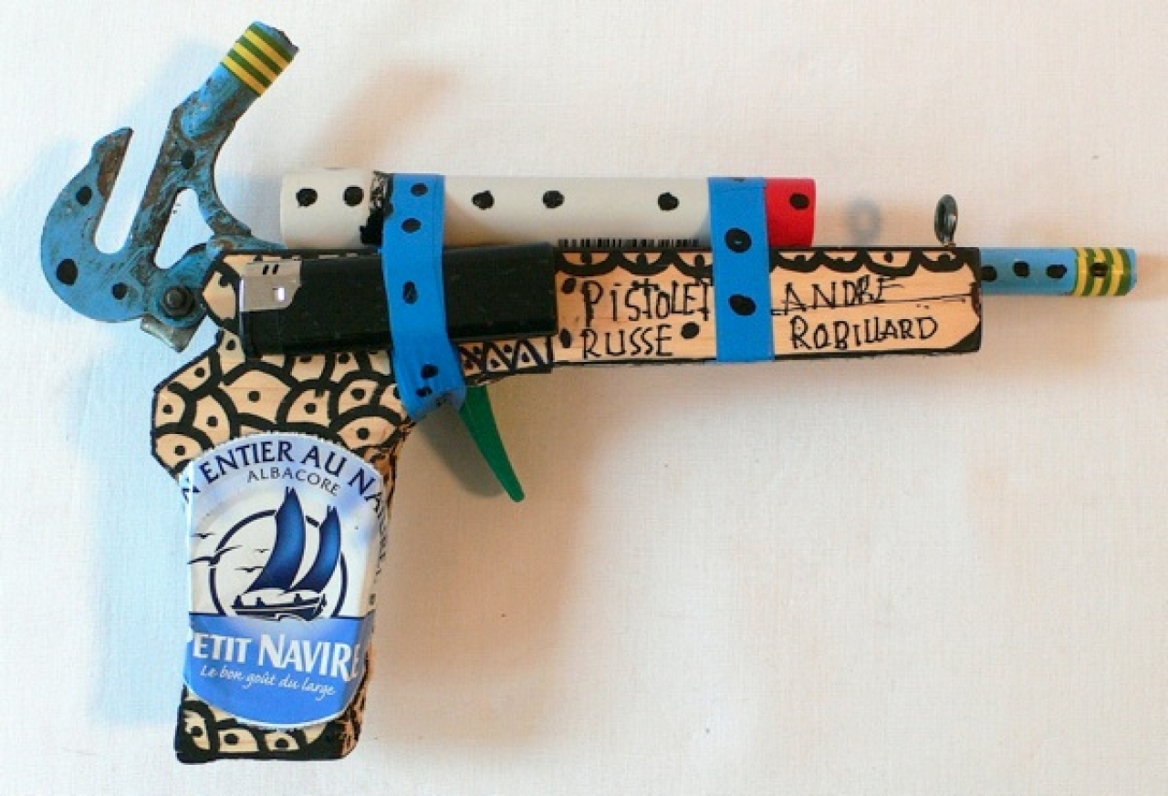 Eén kunstenaar ontroerde me enorm, de outsider André Robillard (1931 Frankrijk). Op Fort Vijfhuizen zal een collectie van zijn geweren (Fusils) te zien zijn. Ze doen me aan mijn gebroken geweertje denken, vrolijke wapens die er heel hippie en vredelievend uitzien, ze roepen op om elkaars hand vast te houden en vrede te maken. Lieve geweren die hij in elkaar knutselt van hout, met dopjes, een gaslamp een aandrijfwiel van de fiets, elastiek, en allemaal in opgewekte kleuren beschilderd en vol taferelen die er op zijn getekend. Met zulke lieve geweren is er meer te winnen dan een oorlog.