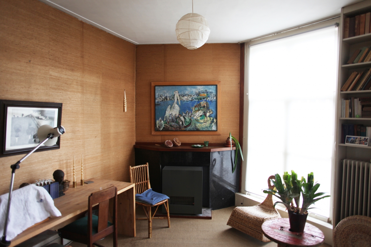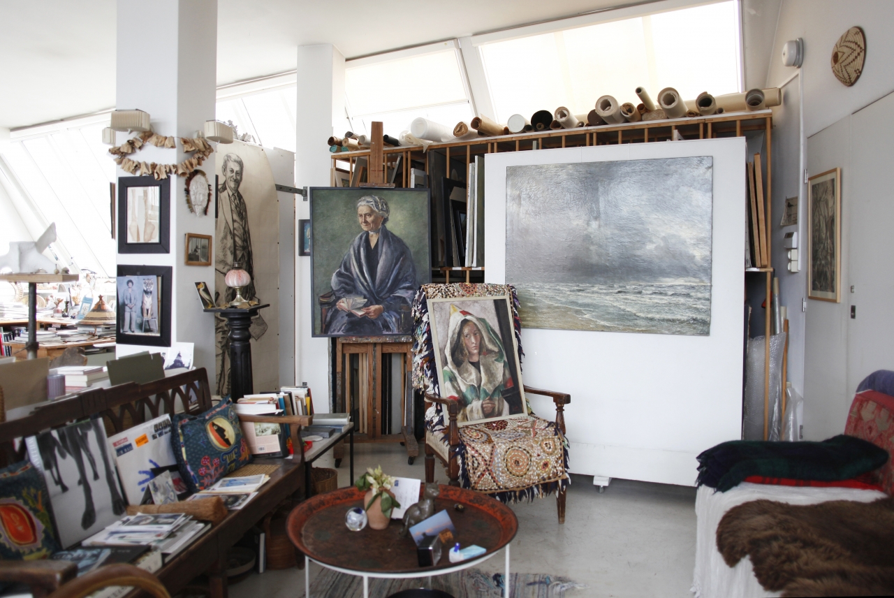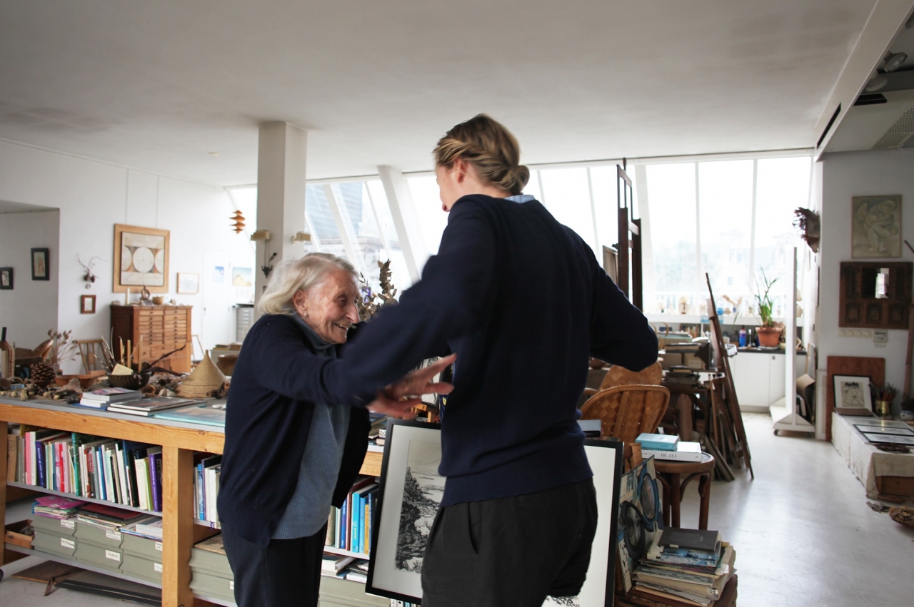 Hier zit ik, naast een eeuwige dame, naast kunstenaar Gisèle d’Ailly van Waterschoot van der Gracht (1912), te midden van haar zelfgesprokkelde en handgemaakte schatten. Ze groeide op in de Verenigde Staten en Oostenrijk, en volgde haar opleidingen in Parijs en in Limburg.5 Daarna vestigde ze zich, na een kort verblijf in het kunstenaarsdorp Bergen, op de Herengracht 401, waar ik me nu bevind. Sinds de jaren tachtig woont en werkt Gisèle op de zolderverdieping van haar grachtenpand. De derde etage bouwde ze, sinds haar intrek aan het begin van de Tweede Wereldoorlog, om tot een pelgrimsburcht, een veilig onderkomen voor geestverwante kunstenaars, bekneld geraakte vrienden en onbeschermde Joodse scholieren, die dankzij het nazi-regime niet langer in vrijheid konden leven. Ze bood de onderduikers haar vriendschap en vertrouwen, stilde hun honger, zorgde voor boeken, penselen en papier. Zeker tegen het einde van de Duitse bezetting was het niet gemakkelijk voor Gisèle om haar medebewoners te beschermen. Er was nauwelijks eten voorhanden en de represailles van de tegenstander werden met de dag grimmiger. Dankzij haar schwung, improvisatievermogen, moedige acties en taaie wilskracht wist ze toch voldoende brood, bieten, pennen, verf en tarwe te ritselen voor haarzelf, maar vooral voor ‘de anderen’.
