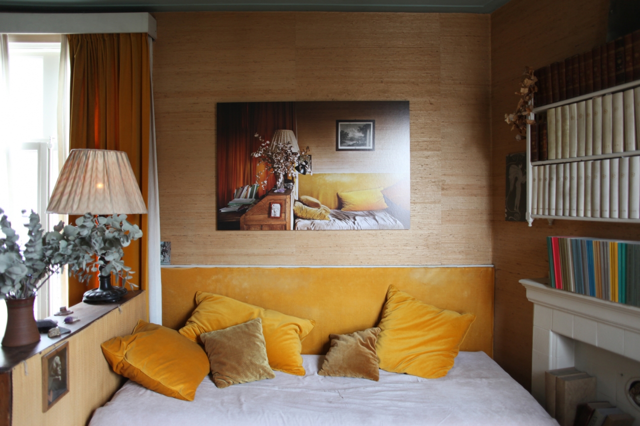 Ik neem afscheid van Gisèle en daal af, naar beneden. Naar de kleine woning op de derde etage waar tijdens de oorlog het clandestiene culturele genootschap samenkwam. De muren zijn bedekt met boeken en portretten van vervlogen vrienden. Gisèle’s sporen zijn ook hier duidelijk aanwezig, opnieuw stuit ik op kleine, gestileerde stillevens, losjes aan elkaar geregen met grillige bladertakken. De tijd lijkt hier stil te staan, de inrichting onveranderd sinds 1940. Maar dat blijkt slechts schijn. Terwijl ik de woonkamer inloop, zie ik vanuit mijn rechterooghoek, vanaf de grond, twee ranke benen van een jonge vrouw gevouwen tussen vensterraam en piano. De benen bewegen, kruipen voorzichtig omhoog. Ze horen bij Amie. Ik vraag haar waar ze mee bezig was. ‘Ik stop kleine repen goudkleurig folie tussen de kieren en spleten die ik hier aantref, zoals dit gouden spleetje hier, dat ik opvulde, boven het portret van de dichter Stefan George. Minuscuul kleine spelonken, die normaal gesproken niet opvallen, probeer ik te laten glimmen, zichtbaar te maken.’ Ik vraag haar hoe ze hiertoe kwam. ‘Toen ik gevraagd werd door Castrum Peregrini om een “tijdelijke ingreep” te ontwikkelen voor deze