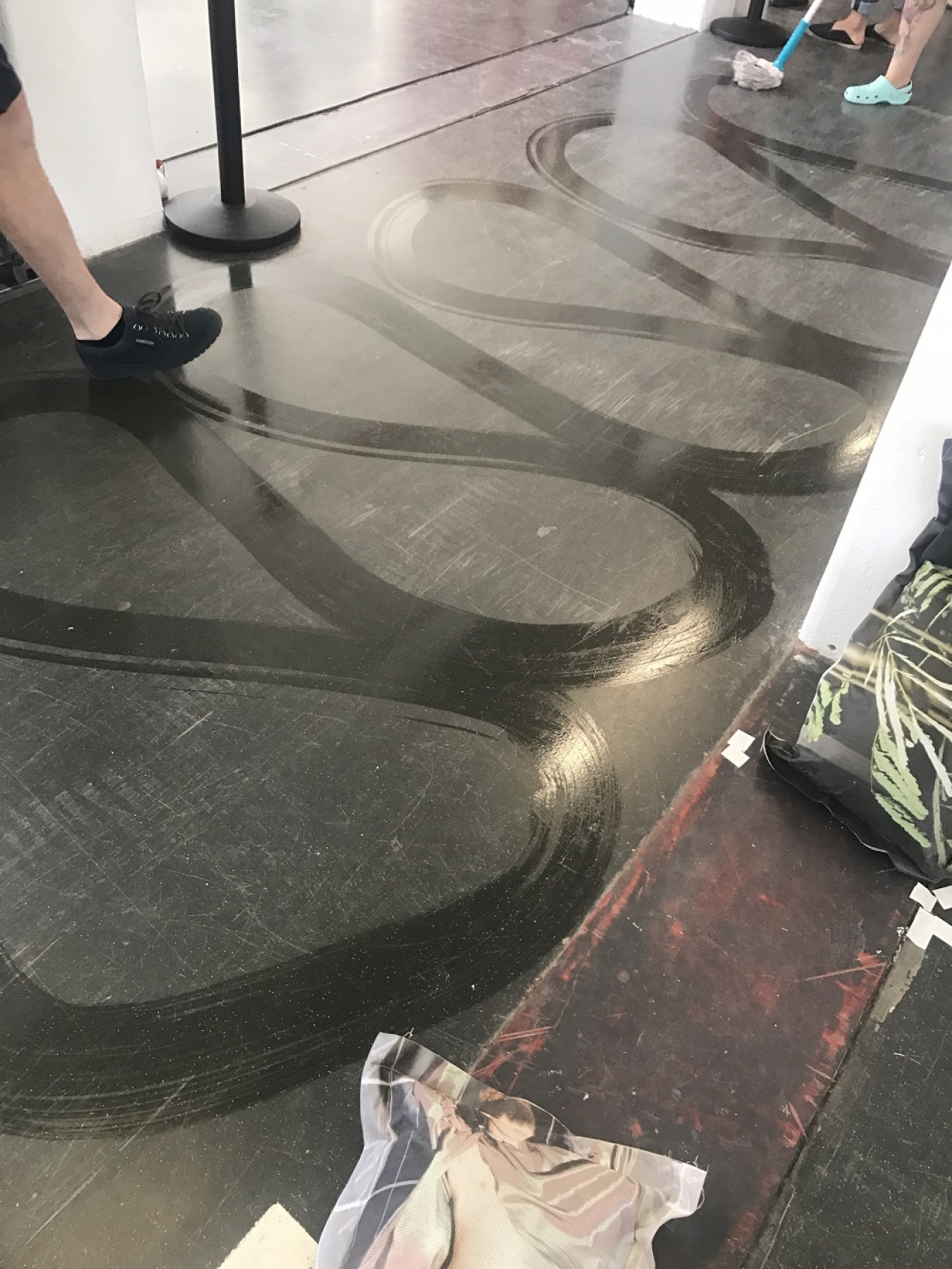 Wat er in deze scène gebeurt is dat de tentoonstelling door de performance in een andere tentoonstelling verandert. De stukjes tape op de grond vind ik briljant, ze vormen een tekening of schilderij, ontstaan door de beweging.