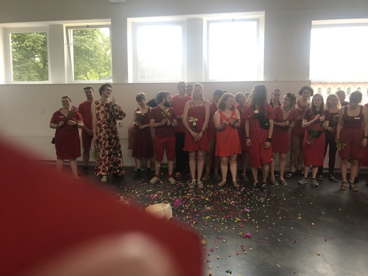 In vijf dagen werden er elf verschillende aktes opgevoerd, in eigenlijk één grote performance. Alles was tot in detail verzorgd, van de online ticket reserveringen, polsbandjes, geweldige conceptuele plattegronden (door de collectiefleden gemaakt) en backstage pasjes tot de toiletjuffrouw, de winkel en een flesje water voor iedere bezoeker. ”We kiezen voor een collectief omdat we geloven dat we samen altijd tot nieuwe bevindingen kunnen komen. Binnen het concept van de eindexamenexpositie willen we een verhouding tot elkaar onderzoeken, om het fragmentarische karakter te vervangen door een weloverwogen geheel”, aldus het gezamelijk statement. Niet elke student zag de noodzaak van het collectief en sommigen bleven daarom liever individueel, zoals Renée Bus,. Zij was niet in het rood gekleed zoals de rest, maar in het groen en blies aandoenlijk op een fluit als de rest gezamenlijk het musicallied zong.