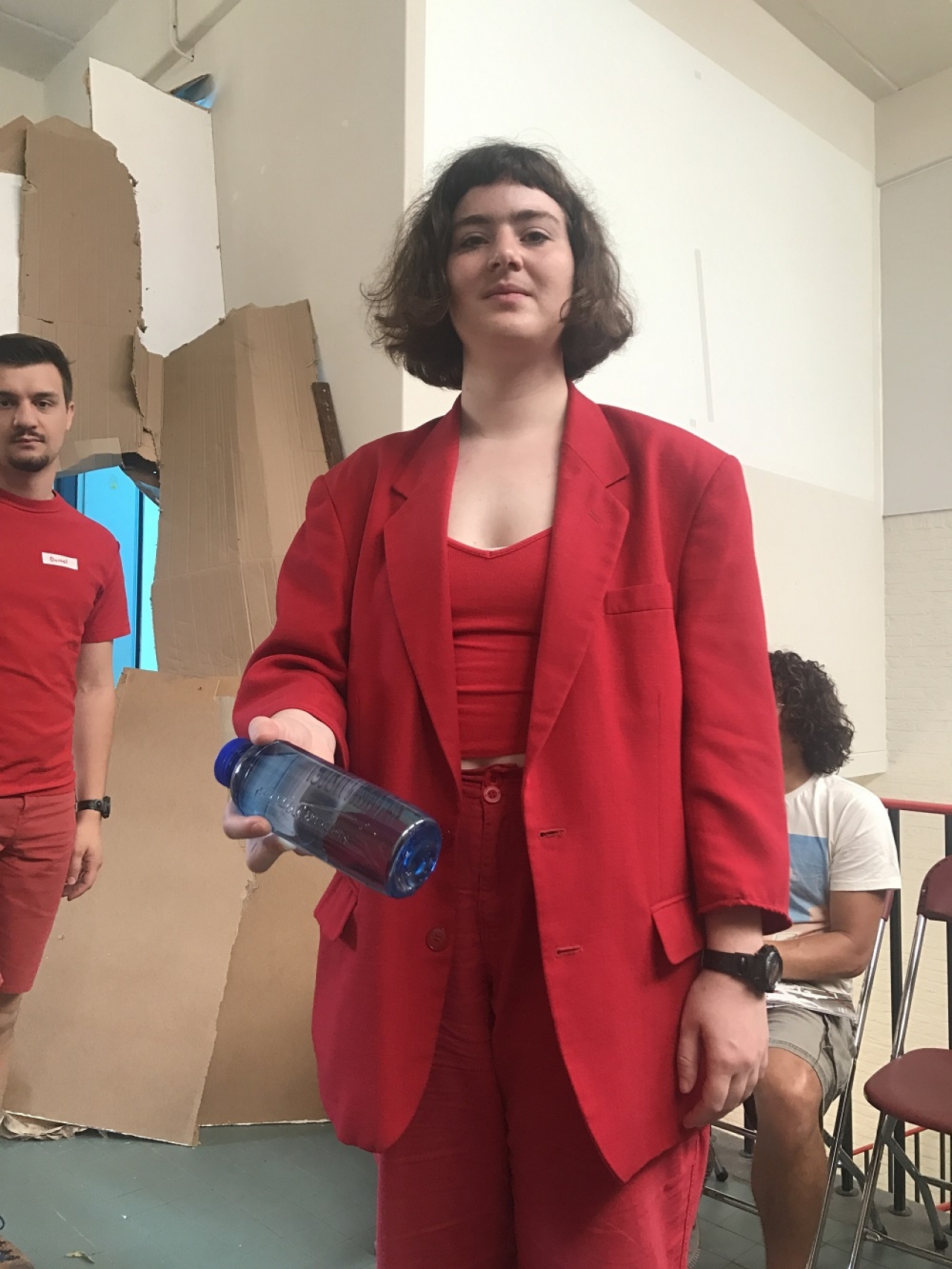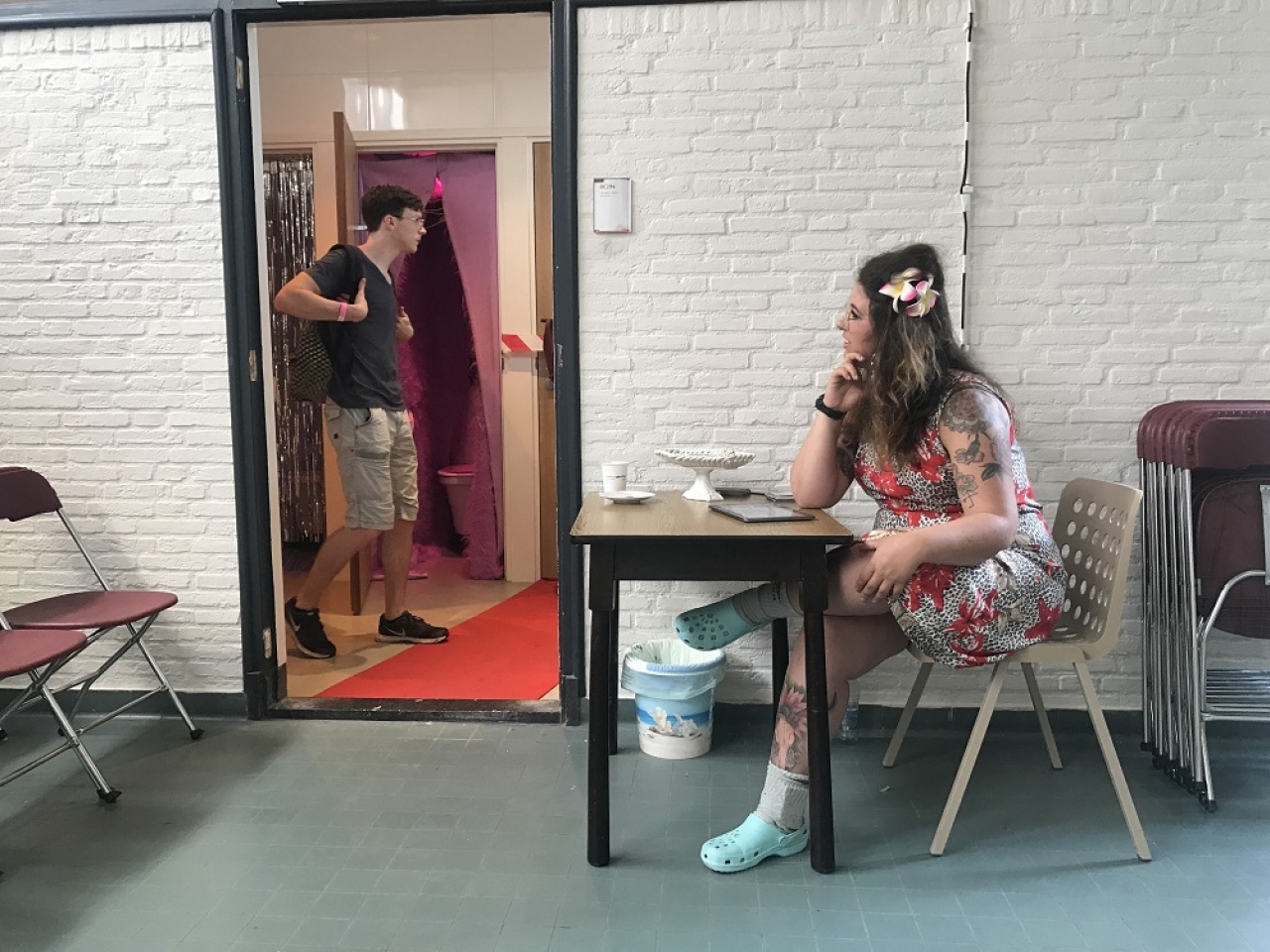Op rode stoeltjes zit iedereen vol verwachting als bij een theatervoorstelling klaar, vlak bij de bont aangeklede toiletten van Zsa Zsa. Er zit publiek in diverse leeftijden. Vrienden? Ouders? Collega’s? In een kleine ruimte van Ian Skirvin beweegt materiaal, midden tussen