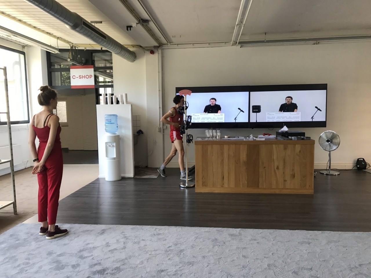 Twee meisjes doen iets, plakken tapejes op de vloer, markerend om objecten heen die later weer verplaatst worden. Er wordt geleurd met grote panelen. Het is muisstil. Ian Skirvin zet een kraan aan; water klatert op een sculptuur. De kraan gaat uit na 5 minuten. Een luid gegorgel ontstaat, de dame naast mij komt niet meer bij van het lachen. De zwaartezakken met foto’s zijn grappig. Men haalt een ring met tule omlaag. Een automatische stofzuiger begint te rijden en te werken. Het zit allemaal heel goed in elkaar.