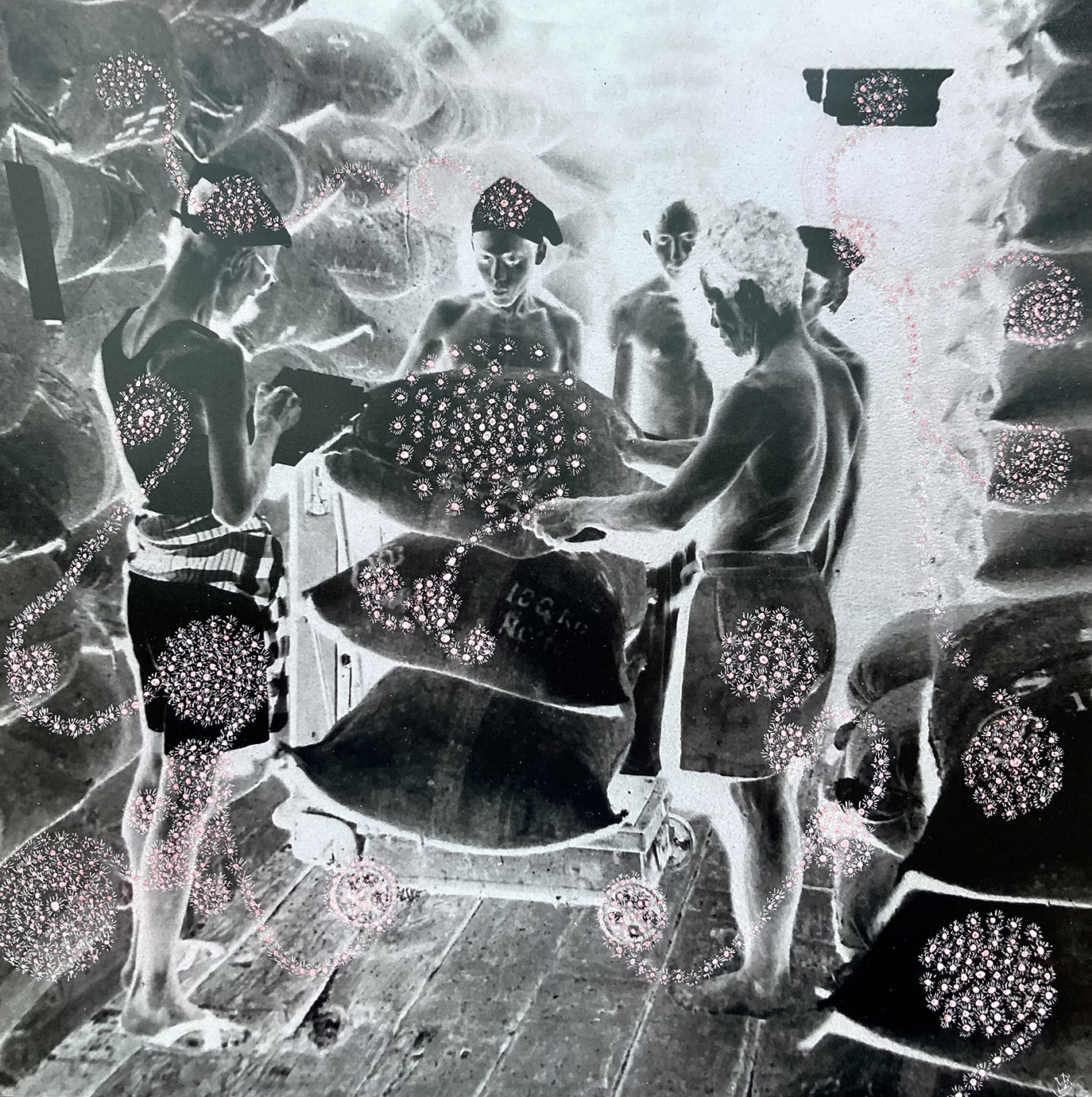 ‘Mijn familiegeschiedenis begint in Friesland waar de Deinema’s en Stienstra’s vandaan komen, maar mijn grootvader vertrok in 1911 naar het voormalige Nederlands-Indië, waar mijn grootmoeder al sinds haar tweede woonde, om daar te gaan werken als administrateur van de cultuuronderneming Siloewok Sawangan op Java, waar cacao, kapok, koffie en rubber werden geproduceerd. Daarover maakte ik in 2022 een kunstproject door afbeeldingen uit mijn familiealbum te bewerken: ik bekraste en perforeerde ze en wreef ze in met kleur. Ik zie het als een vorm van iconoclasme, een beeldenstorm, om dat gekoesterde beeld van wat vergoelijkend ‘andere tijden’ wordt genoemd, kritisch te benaderen. In mijn ogen zijn het altijd andere tijden – het is van alle tijden. Ongelijkheid en onderdrukking zijn nooit te rechtvaardigen en zeker niet uit gevoelens van nostalgie gebaseerd op superioriteitsdenken en hiërarchische verhoudingen. Nederlanders die in Indonesië hebben geleefd spreken bijvoorbeeld met ontroering over de baboe door wie ze zijn verzorgd, maar hoe die baboe heette weten ze niet, haar naam kennen ze niet.