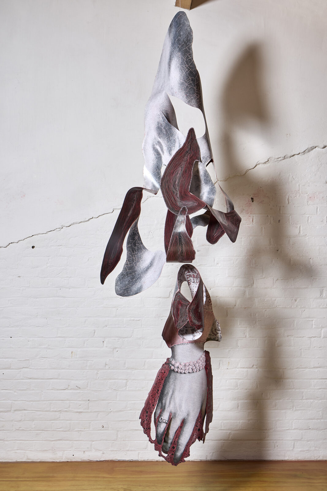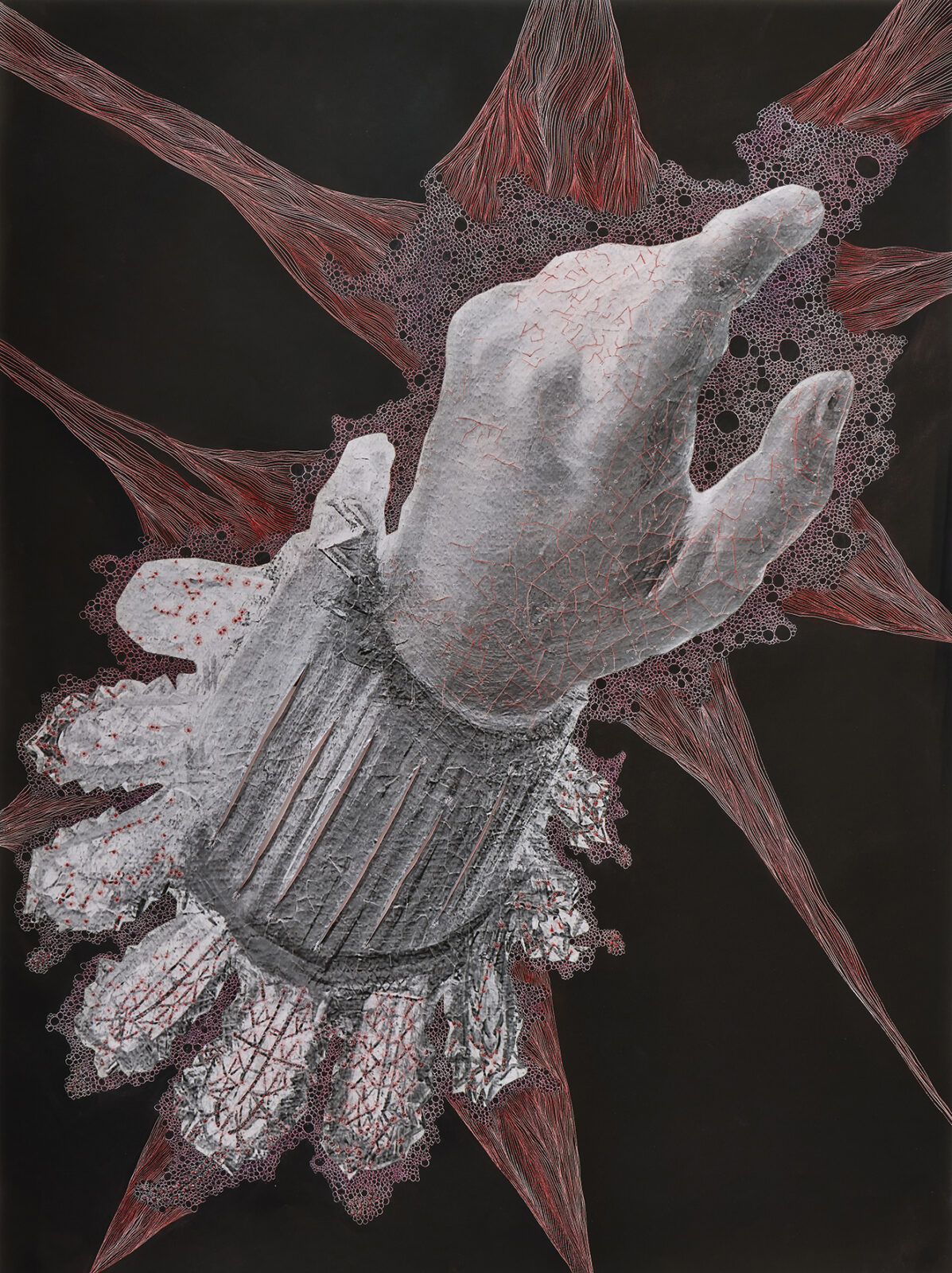 ‘Het krassen in foto’s verbeeldt voor mij de sporen die het leven met zich meebrengt – lijnen als herinneringen, ingeschreven in een huid van papier. Door ze te vullen met zachte pasteltinten, zoals roze en rood, verzacht ik hun scherpte. Deze kleuren verwijzen naar de kwetsbaarheid van het lichaam waar elke ervaring een afdruk achterlaat.’