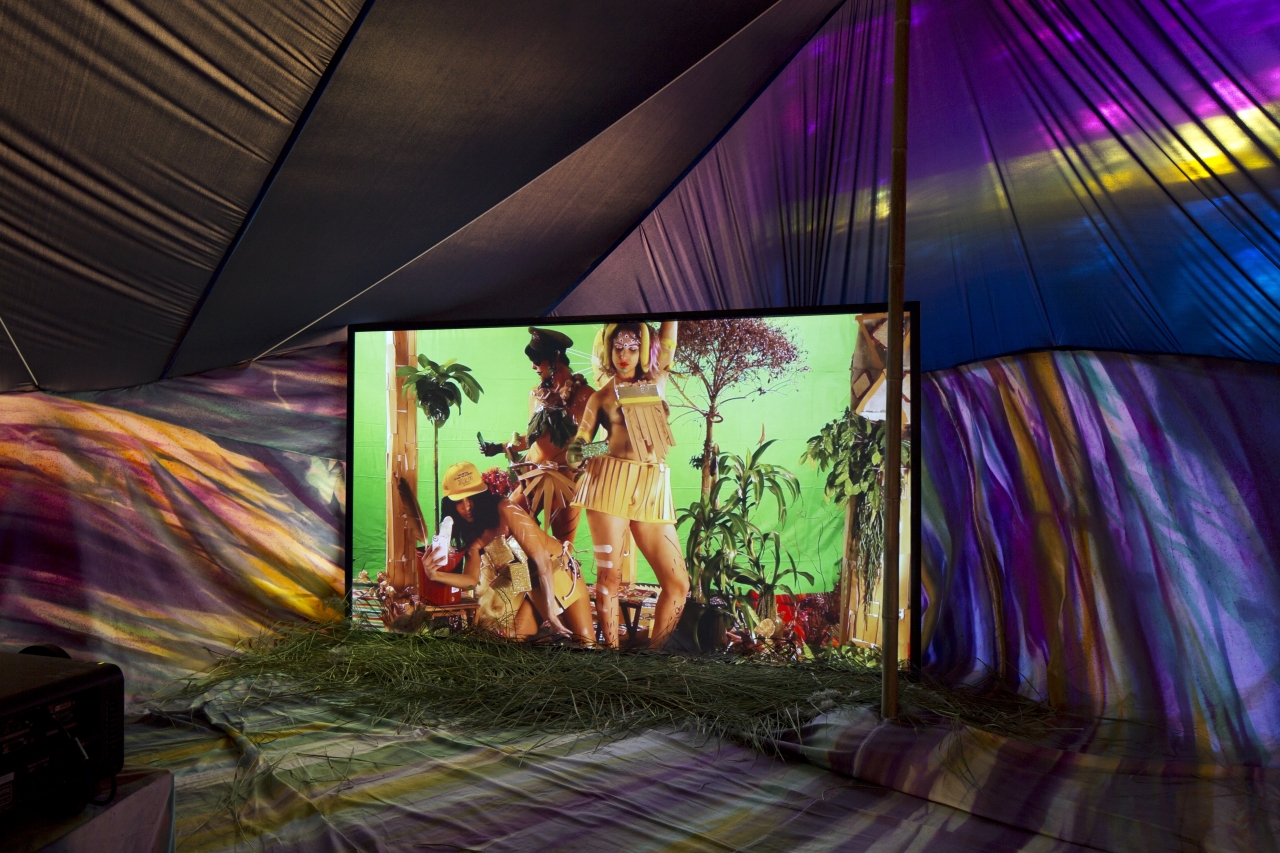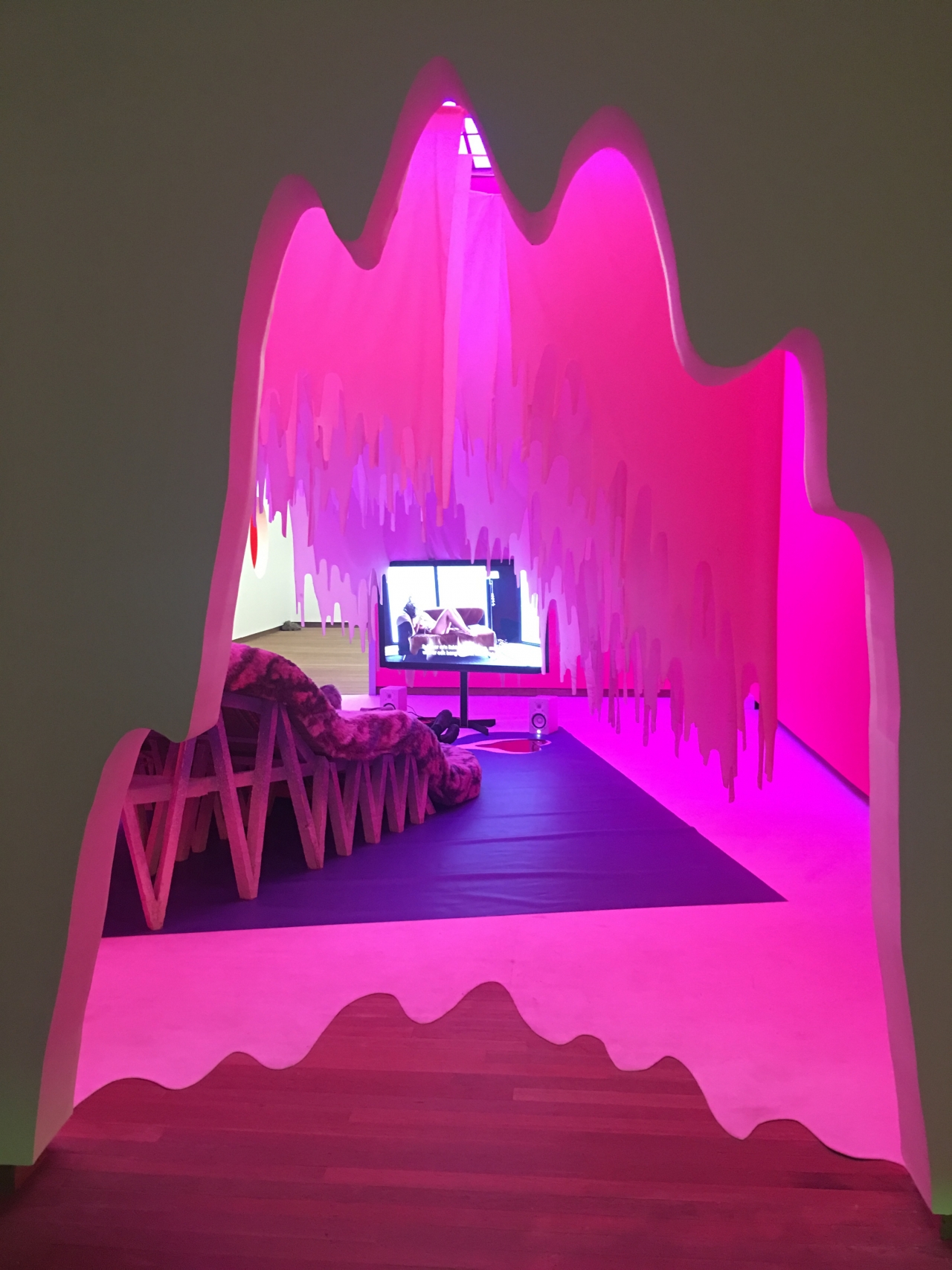Zo drentelt de bezoeker nietsvermoedend een pimpelpaarse grotta binnen waar Night Soil #2 / Economy of Love te zien is. Ragfijne stalactieten druipen vanaf het plafond omlaag en sidderen bij iedere ademteug. Met al dat roze en rood is een vergelijking met de moederschoot snel gemaakt. In het midden van de ruimte staat een harig zitmeubel dat zo uit het ruimteschip van Barbarella lijkt te zijn geplukt. Het vachtcontact moet onze honger naar aanraking stillen, maar bij gebrek aan een echte streling kijken we dan maar naar het scherm waar twee geduldige sekswerkers een derde vrouw laten klaarkomen. We zien prachtige beelden van naakte vrouwen in arcadische bossen en ongerepte sneeuwlandschappen. Ze kijken frank en vrij de camera in terwijl ze zichzelf bedelven onder pigmenten en poeders. We horen jubelverhalen over hun seksuele bevrijding en de voice-over vertelt over een energetische snelweg tussen hart en clitoris en dat het orgasme de oerknal is van het menselijk bestaan.