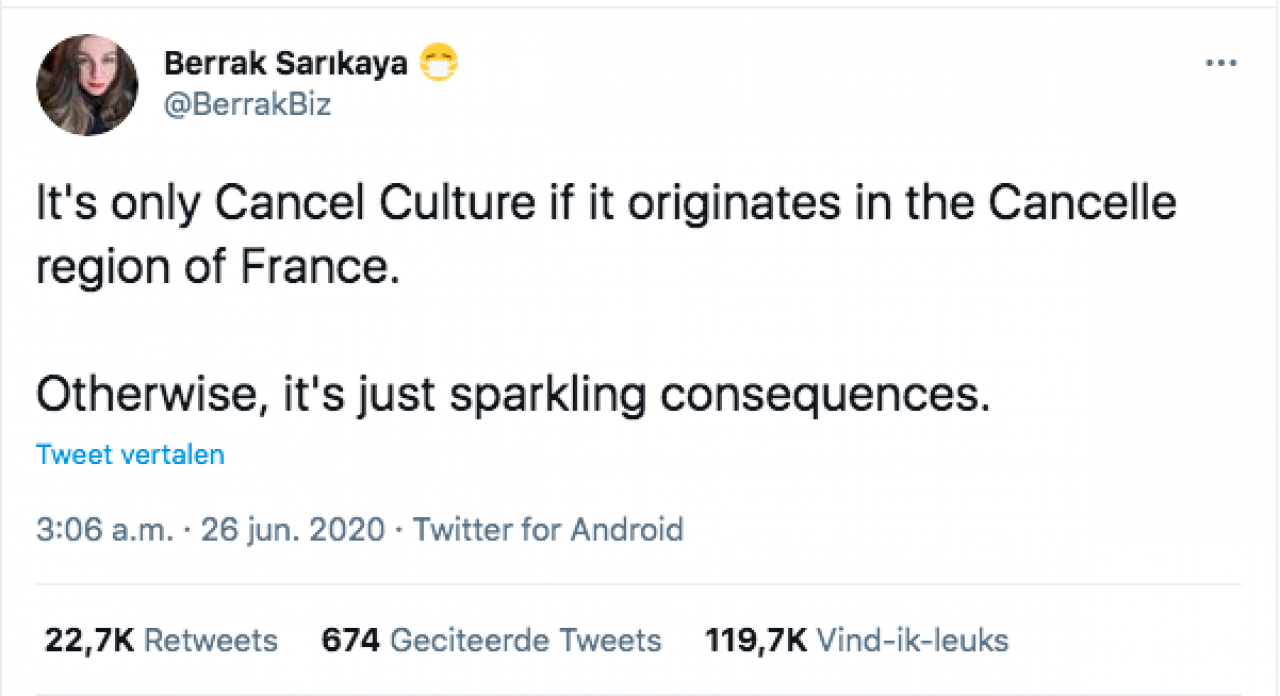 (“Het ontbreken van overleg bij het bestraffen van slechte actoren, verkeerd geïnterpreteerd als de uitkomst van de cancel culture, is een fout van het onvermogen van de elite om te bevatten wat de impact is van de verbondenheid van sociale media voor het verschuiven van de machtsdynamiek van de publieke sfeer in het digitale tijdperk.”)