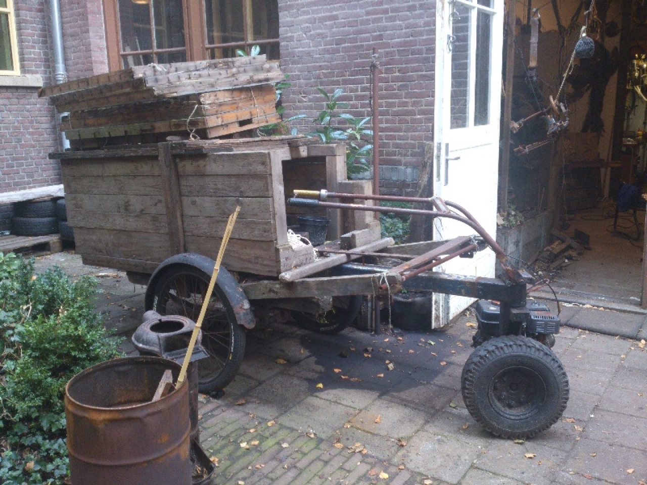 Ik vermoed dat de kunstenaar elke kans aangrijpt om niet binnen te hoeven zitten. We zitten nog geen vijf minuten op onze uit draadstaal gevlochten stoelen als hij alweer opveert om me het voertuig te tonen dat hij voor de tocht naar Venray in elkaar zette. Hij zwaait de grote, zware deuren van het atelier open en lijkt haast opgelucht om de buitenlucht te kunnen proeven. Midden op de binnenplaats torent een imposante boomhut. ‘Die hebben we samen gebouwd,’ zegt Zwartjes, mijn blik volgend, en hij gebaart naar een buurman die een eindje verderop van een biertje zit te genieten. Nog voordat ik de man kan groeten, heeft Zwartjes zich alweer omgedraaid. Hij loopt in de richting van een roestige bakfiets die achter ons op de tegels staat geparkeerd. ‘Hij deed het goed, maar maakte nogal veel herrie,’ zegt hij met een brede grijns, terwijl hij me de motor demonstreert die hij zelf op het gevaarte bouwde. ‘De tractor die ik maakte voor mijn reis naar Ameland wat dat betreft beter was gelukt,’ vertelt hij niet zonder trots. Dat voertuig kan hij me helaas niet laten zien, omdat het op dat moment is opgenomen in een tentoonstelling rondom het thema ‘Utopia’.