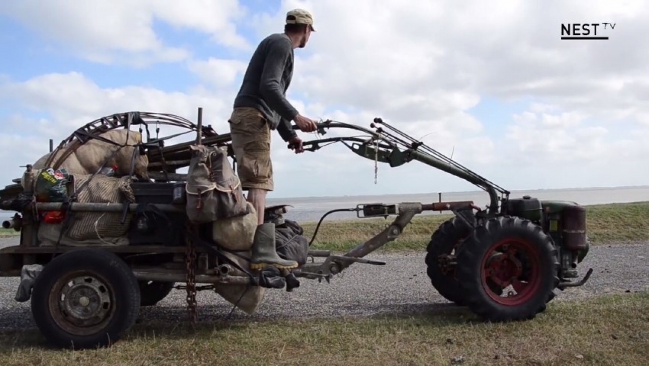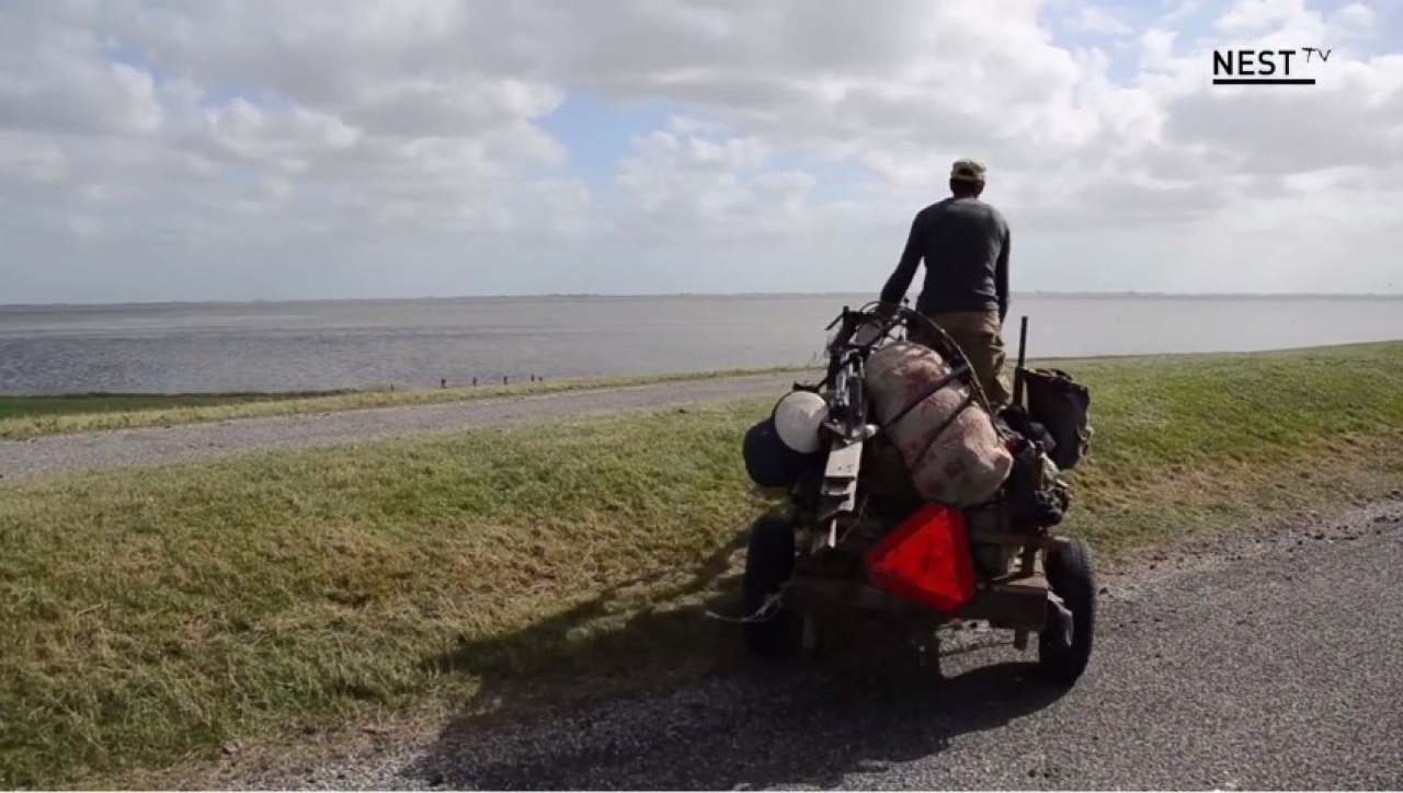 Wéér dwalen mijn gedachten af naar Rousseau en wat hij schreef in zijn ‘Overpeinzingen van een eenzame wandelaar’, namelijk dat zijn tijd van afzondering op een klein eiland hem tot zichzelf deed komen en de kracht van zijn verbeelding aanwakkerde. De filosoof schreef: ‘[Ik kan] niet geloven dat ik de enige ben met een dergelijke ingeboren neiging, ofschoon ik deze tot nu toe bij niemand anders heb aangetroffen.’ Ook Zwartjes verbaasd dat niet veel meer mensen het soort tocht ondernemen als zijn reis naar het Waddeneiland: ‘Naar mijn mening is dit veel natuurlijker dan deel nemen aan het leven in de overgereguleerde maatschappij,’ en hij vertelt hoe zijn reis daaruit de ultieme ontsnapping was, omdat hij zich volgens eigen zeggen ‘tussen de mazen van de wet door bewoog.’ Hij legt uit hoe hij drie nachten in een zelfgebouwde tent op het strand van Ameland sliep – een tent opgetrokken uit met mest doordrenkte doeken – terwijl wild kamperen op Ameland verboden is, en dat hij bovendien zijn tocht aflegde op een voertuig zonder vergunning, zonder onderweg te zijn aangehouden. ‘Waarschijnlijk omdat ze niet wisten onder welke wet mijn kar zou vallen,’ grapt hij triomfantelijk. ‘Het was echt verademing me zo buiten de juridische structuur te bewegen.’