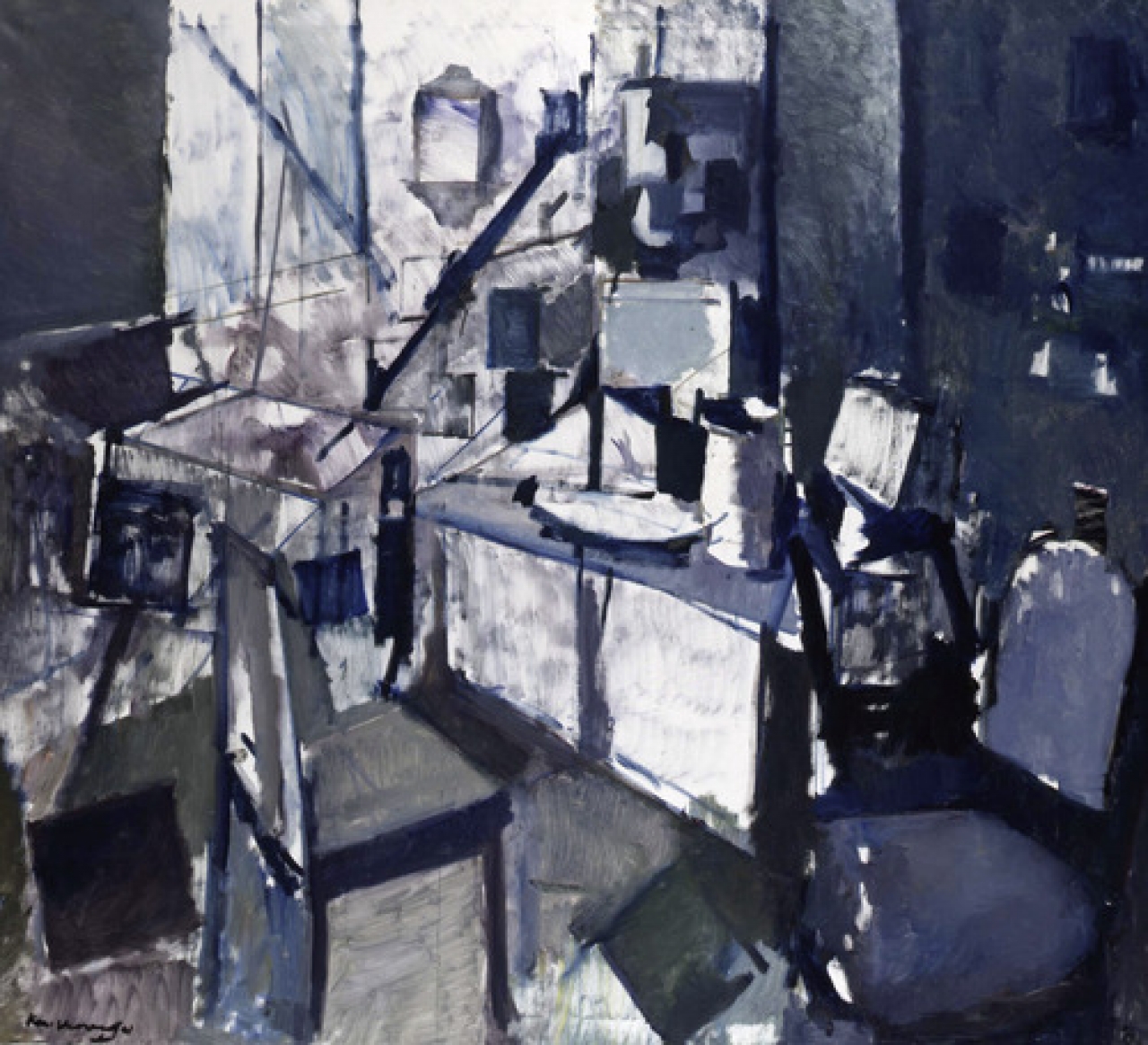 De kunstenaar Kees Verwey is, zo denk ik wanneer ik naar zijn schilderijen kijk, verschillende keren in dit moment geglipt. Op de schilderijen van dit uur is zijn atelier herinneringsloos geworden. In werkelijkheid heeft hij al vele tientallen keren zijn atelier als uitgangspunt voor zijn schilderijen genomen. Hij kent elke vorm en elke hoek. Hij weet dat het tafeloppervlak, de bloemen, de stof van het gordijn tinten hebben, hij weet ook hoe die tinten gemengd en aangebracht moeten worden. Maar nu schildert hij het zonder gisteren of morgen en hij doet dat in twee kleuren blauw. Hij gebruikt zijn lievelingskleur ultramarijn plus groenblauw. Hij mengt er zelfs wat geel door waardoor er groene schaduwen ontstaan. Hij mengde ultramarijn met rood, er zijn lila vlakken, en hij mengde het groenblauw met rood waardoor er diepe, zogenaamde warme grijze tonen zijn. Hoe langer je kijkt, hoe meer kleur de grijstinten krijgen. Groen, rood, oranjebruin, zeegroen, lila. Maar het allerbelangrijkste en mooiste is de lichtinval. Daar waar nog het licht valt, want de zon is nét onder, daar heeft hij uiterst licht met een penseel met ultramarijn over het canvas gestreken. Over het witte licht, ligt een blauwgrijze sluier. Deze sluier is de redding, de redding om te blijven kijken. Zou hij dit wit niet gesluierd hebben dan zou er namelijk iets met het licht kunnen gebeuren dat we van iets anders heel kennen.