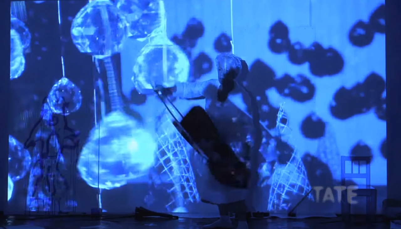 Blauw licht kan ons een wereld inbrengen die buiten onze gewone, gekende wereld ligt. Met de performance die Joan Jonas in 2013 in Tate Modern gaf, worden we ook een mysterieuze wereld ingetrokken. Net als het werk van McQueen is er een ruimte die baadt in blauw. Jonas speelt, danst, tekent en zwaait met attributen in het blauw lichtende landschap. Ze staat op een podium en wordt door een beamer bestraald met een film van kristallen, glazen pegels die het blauwe licht kaatsen en reflecteren. Op de achterwand speelt een film van een berglandschap. Op deze achterwand tekent Jonas later met een blauwe stift vissen. Deze vijftien minuten durende performance was live te volgen via het videokanaal van het museum. Jonas begint de eerste minuten rustig, we kunnen even aan de blauwe wereld met kristallen wennen als ze met een zonnebril op een instructie voorleest. Als de muziek begint en ze gaat bewegen, komt de magie tot leven.