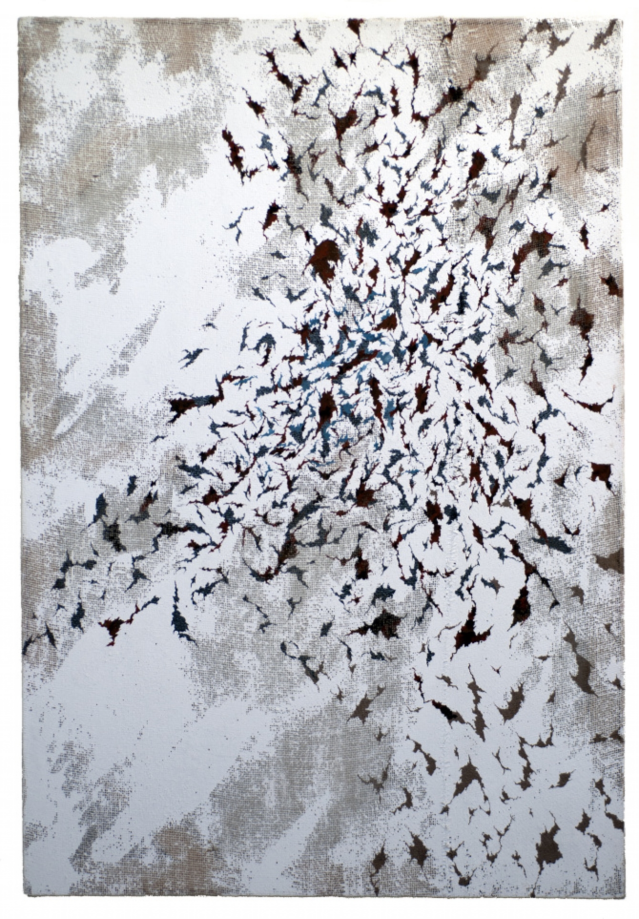Haar schilderij is een samenkomst van materialen, de letters zijn fluorescerend groen en tintelen van beweging. Mirthe Kluck zocht naar een equivalent voor de geluiden van een computergame. Het werk maakt stille geluiden, zou je kunnen zeggen, omdat het vibreert op het oog. de dans op je oog. In het zoeken naar een esthetiek van de toekomst laat ze zich inspireren door films, Het groen waarmee ze de letters schilderen is metaallak, een vreemde fascinerende substantie. En waarom ‘alienbloed’? Omdat in horrorfilms vaak een boodschap in bloed wordt achtergelaten, zo laat deze alien zien dat hij zijn boodschap serieus neemt want hij heeft het immers met zijn eigen bloed geschreven.