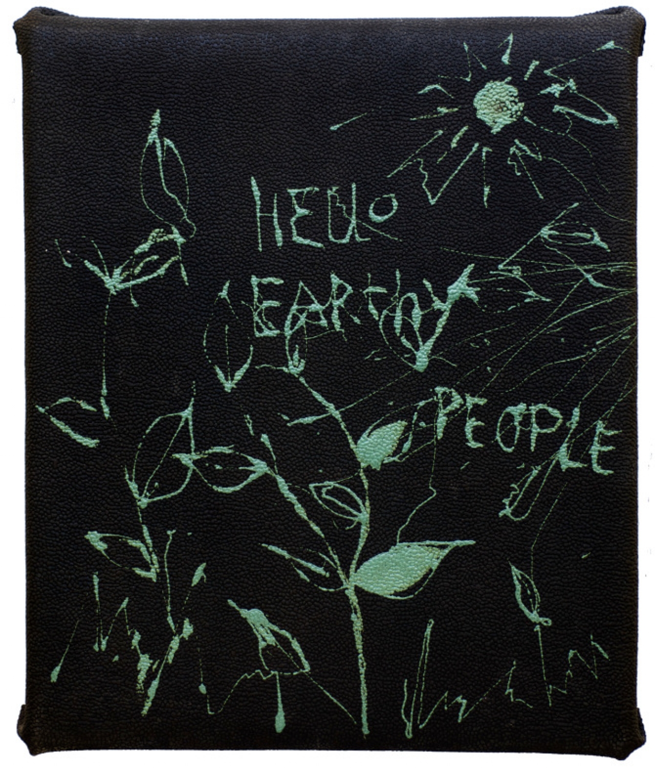 Het moment dat ik het schilderij van Mirthe Kluck zag wist ik het, dit is het ideale kunstwerk om mee wakker te worden. Hello earthy people, hello earthy people! Een heerlijke optimistische uitroep in fluorescerende vreemde groene letters die bijna van het doek afspringen. Doek? nee, het is een vreemde gebobbelde dikke ondergrond, die in de hoeken punten vormt, alsof het schilderijtje oren heeft gekregen. Hello earthy people, ja ook goedemorgen. Ik ben maar een van de vele miljoenen hier op aarde, een klein splintertje, dus voor ik mij weer zorgen ga maken, over dat de koffiefilter niet meer in de goede maat te koop is, of ik wel genoeg vrienden heb, over de kwaliteit van mijn leven, .. over.. maar waarom zou een stofje zich zorgen maken?