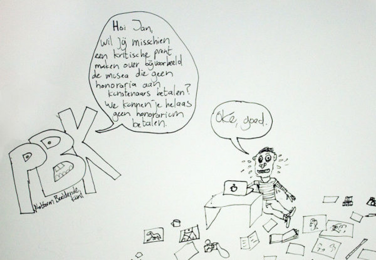Enige tijd geleden werd ik gevraagd om als expert plaats te nemen in een selectiecommissie voor een grote kunstmanifestatie. Er was geen budget om mij voor mijn tijd en expertise te betalen. Toen ik vroeg waarom dit was, werd mij simpelweg verteld dat dit nooit het geval is voor leden van de selectiecommissie. Vreemd. Want om ‘expert’ te worden, heb ik vele jaren gestudeerd (waarvan een hoge studieschuld het bewijs is) en heb ik sindsdien de ervaring opgedaan om mij geschikt te maken voor een dergelijke commissie. Er werd mij verzekerd dat het een hele leuke dag zou worden die tevens de mogelijkheid biedt om met interessante mensen te netwerken. Deze reactie schoot mij in het verkeerde keelgat. Immers, waarom zou het feit dat ik mijn werk leuk vind het aanvaardbaar maken dat ik er niet voor betaald krijg? Er zijn vast ook veel doktoren, bankiers en tuiniers die iedere dag met plezier naar hun werk gaan, die krijgen dan toch ook gewoon betaald?